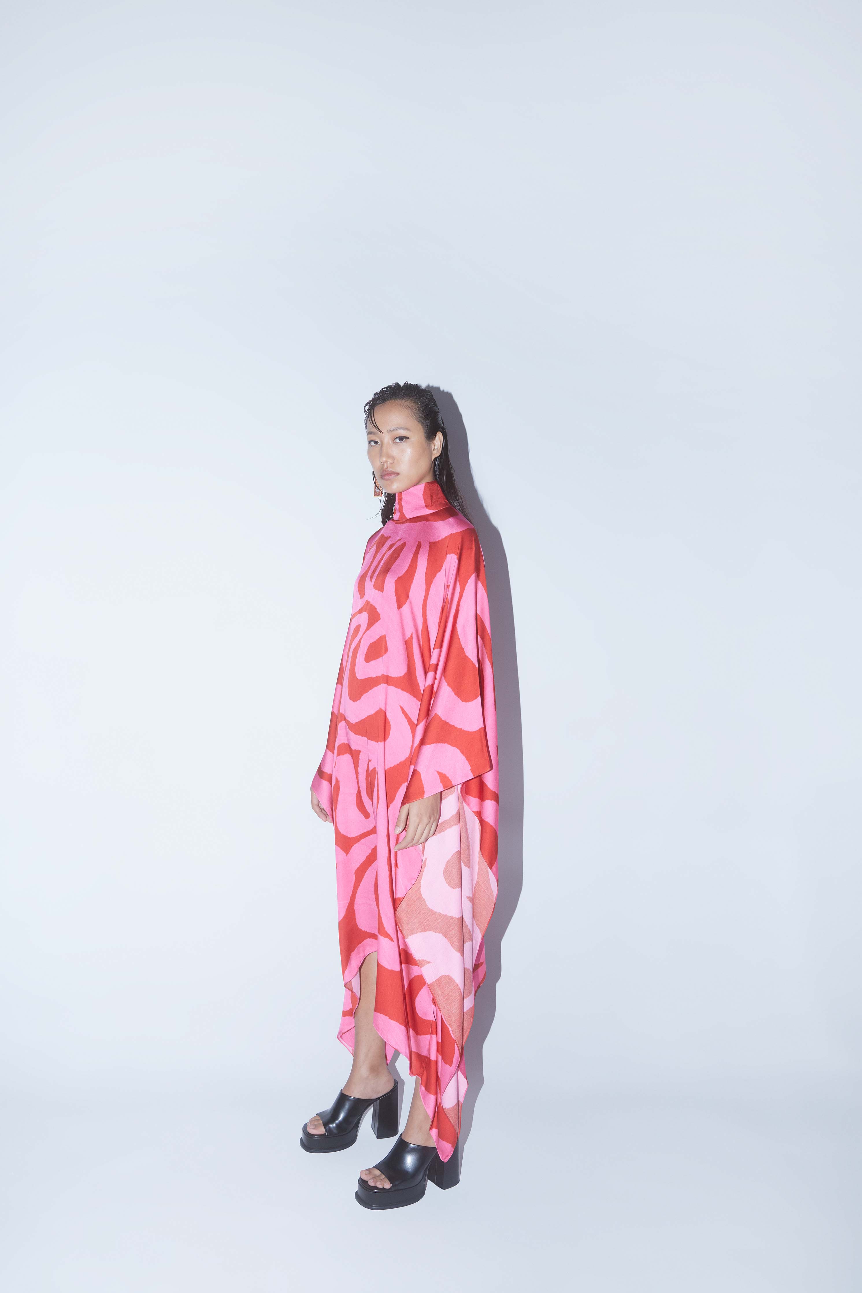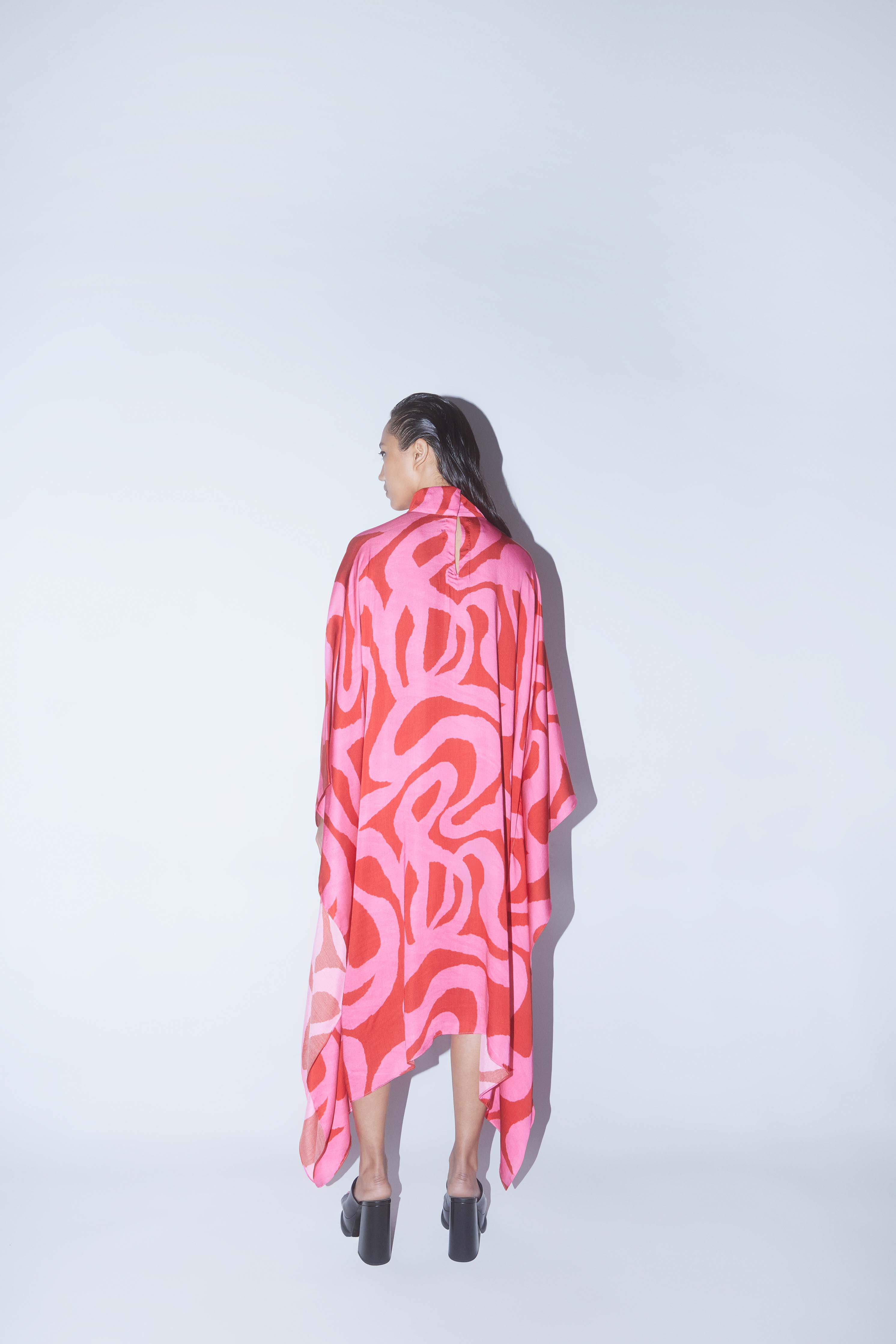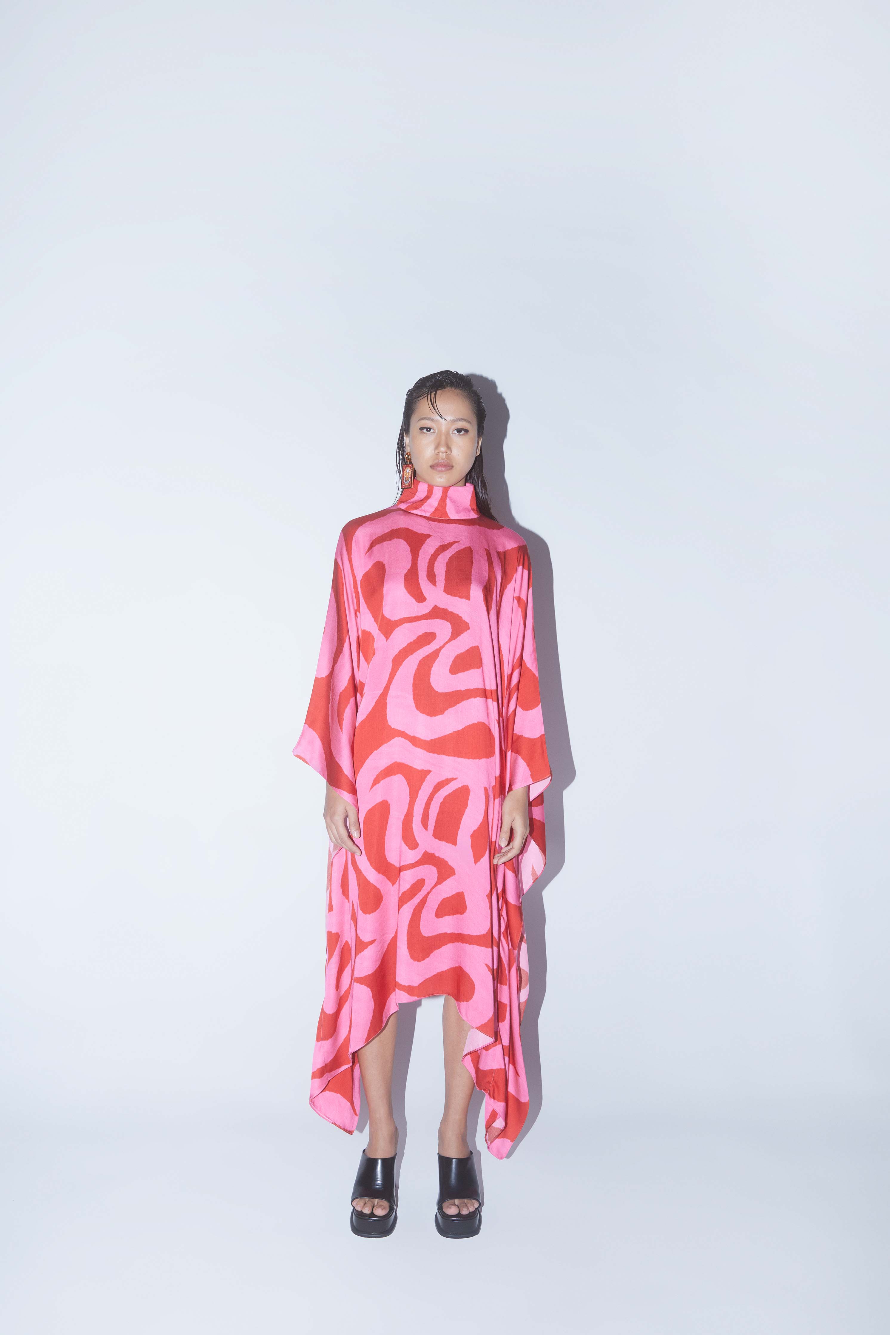 The Candy Round Collar Kimono Dress crafted from our stunning vegan silk fabrication, this trans seasonal piece is a statement. Made in our statement abstract two tone candy print this is a trend setting piece. With Free Size Kimono Style sleeves and a round neck collar, the piece is easy to wear and relaxed. Featuring a centre back opening, the dress is calf length. Pair it will heels for an elegant look.