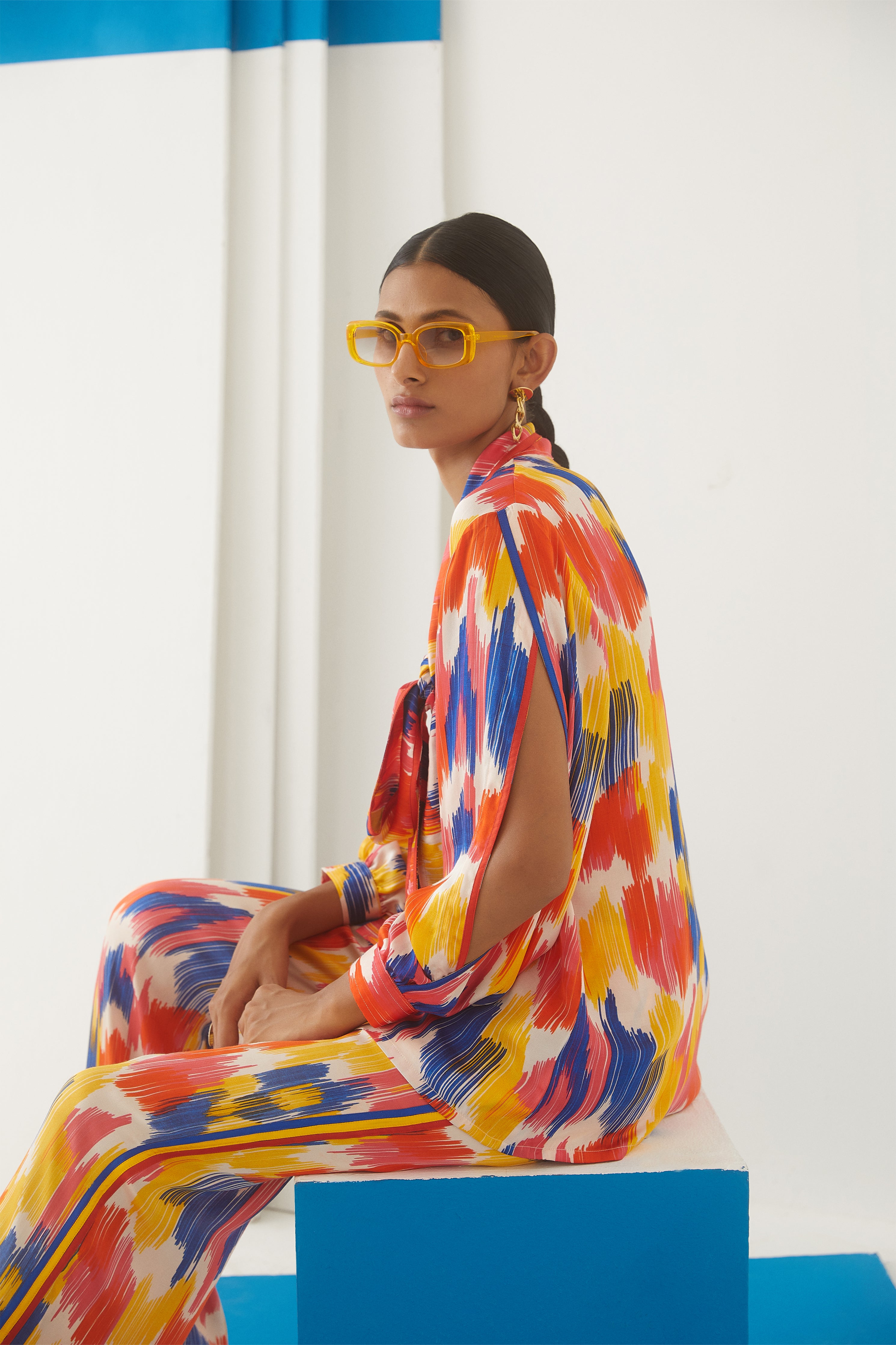 The Ikat Knot Shirt & Trousers Co-ord crafted from our stunning vegan silk fabrication, trans-seasonal, is a statement piece. Made in our Ikat Check Print, this is a trend setting piece. Featuring a straight shirt with sleeve slits and contrast piping, this piece is versatile and has a front opening with a knot. It is paired with matching ikat trousers with piping on the side. Pair it with heels for a festive look.