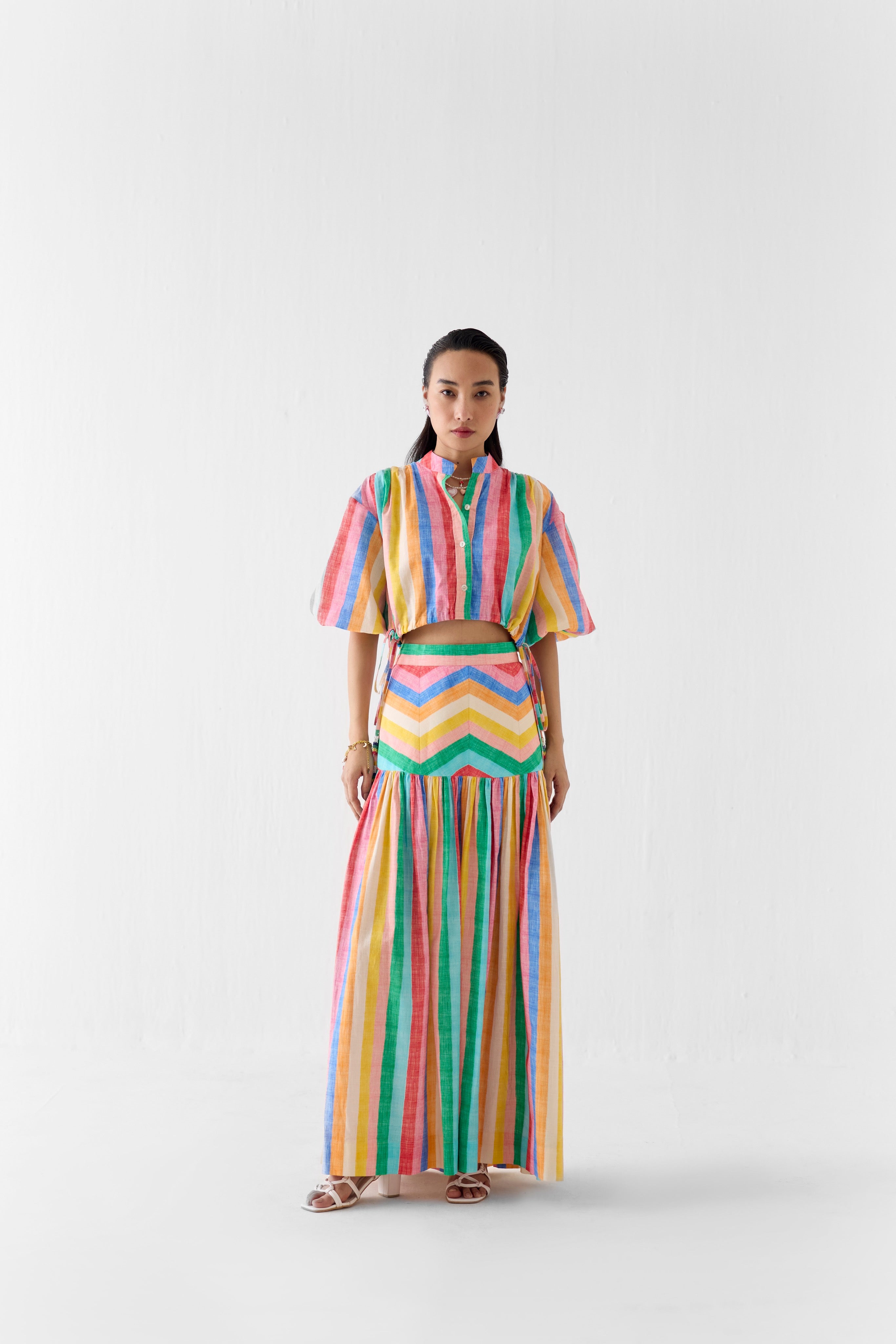 Silhouettes are relaxed yet intentional — easy, breezy boxy shirts paired with tailored shorts; effortless shift dresses; comfortable waist-cinched maxis; chic crop tops styled with fluid trousers; and oversized kimonos that lend a distinct resort-wear sensibility. Each piece is designed for movement, ease, and understated sophistication.