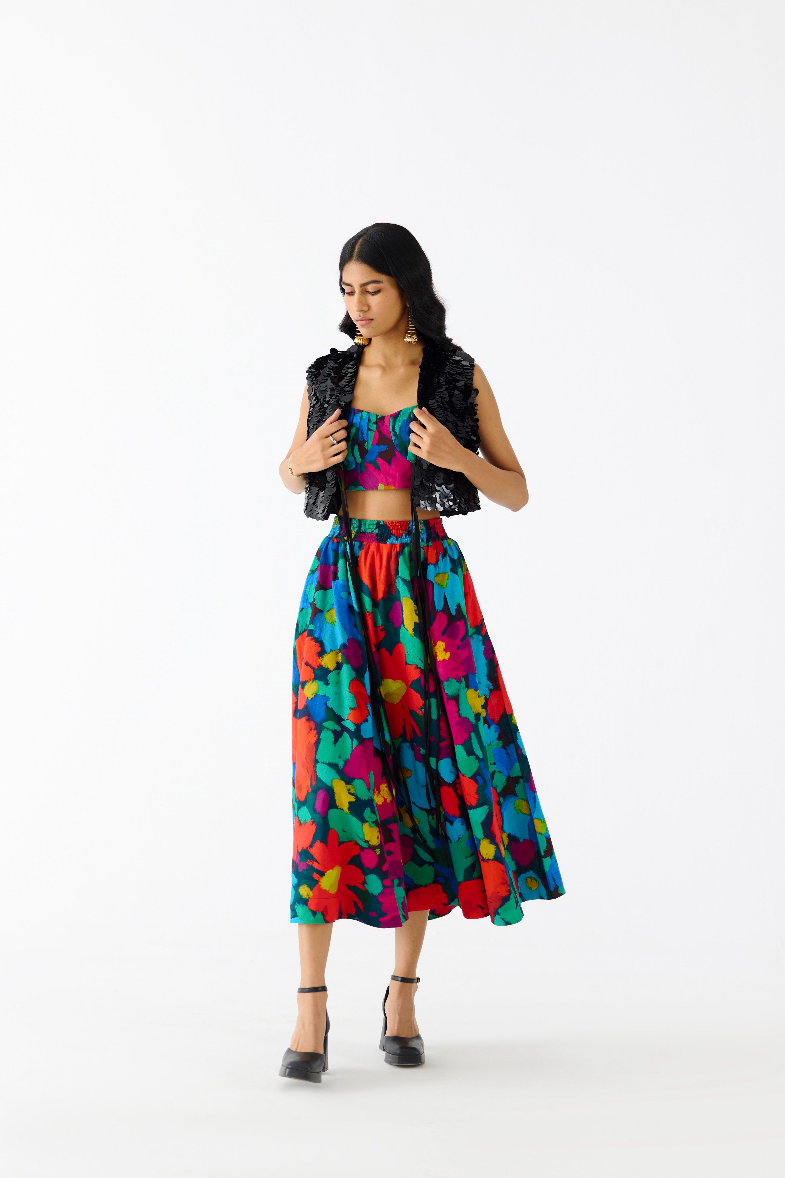 The Anima bustier crafted from our stunning 100% cotton fabrication, trans-seasonal, is a statement piece. This bustier, digitally printed in our hand drawn anima floral print is lined. With a bustier top, this top has a ruched back. It has embroidered straps with hand beaded and tassle details. It can be paired with our matching skirt which has an elasticated waist and pockets. Wear it with heels for an elegant look.