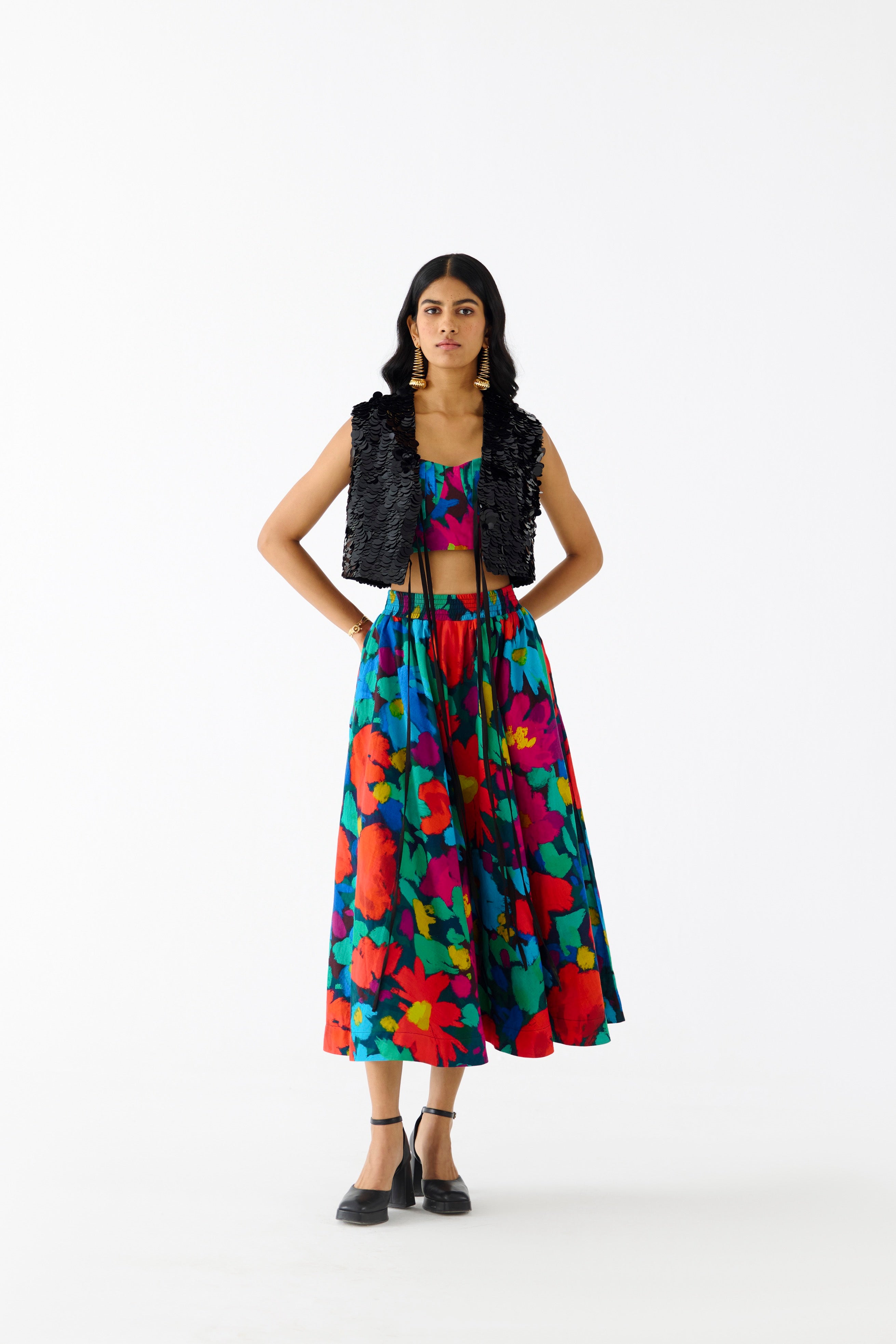 The Anima bustier & Skirt crafted from our stunning 100% cotton fabrication, trans-seasonal, is a statement piece. This set, digitally printed in our hand drawn anima floral print is lined. With a bustier top with straps, this top has a ruched back. The top has been hand embroidered with tassels and beads. The skirt has an elasticated waist and pockets. Featuring a formal look, the set has a voluminous look. Wear it with heels for an elegant look.