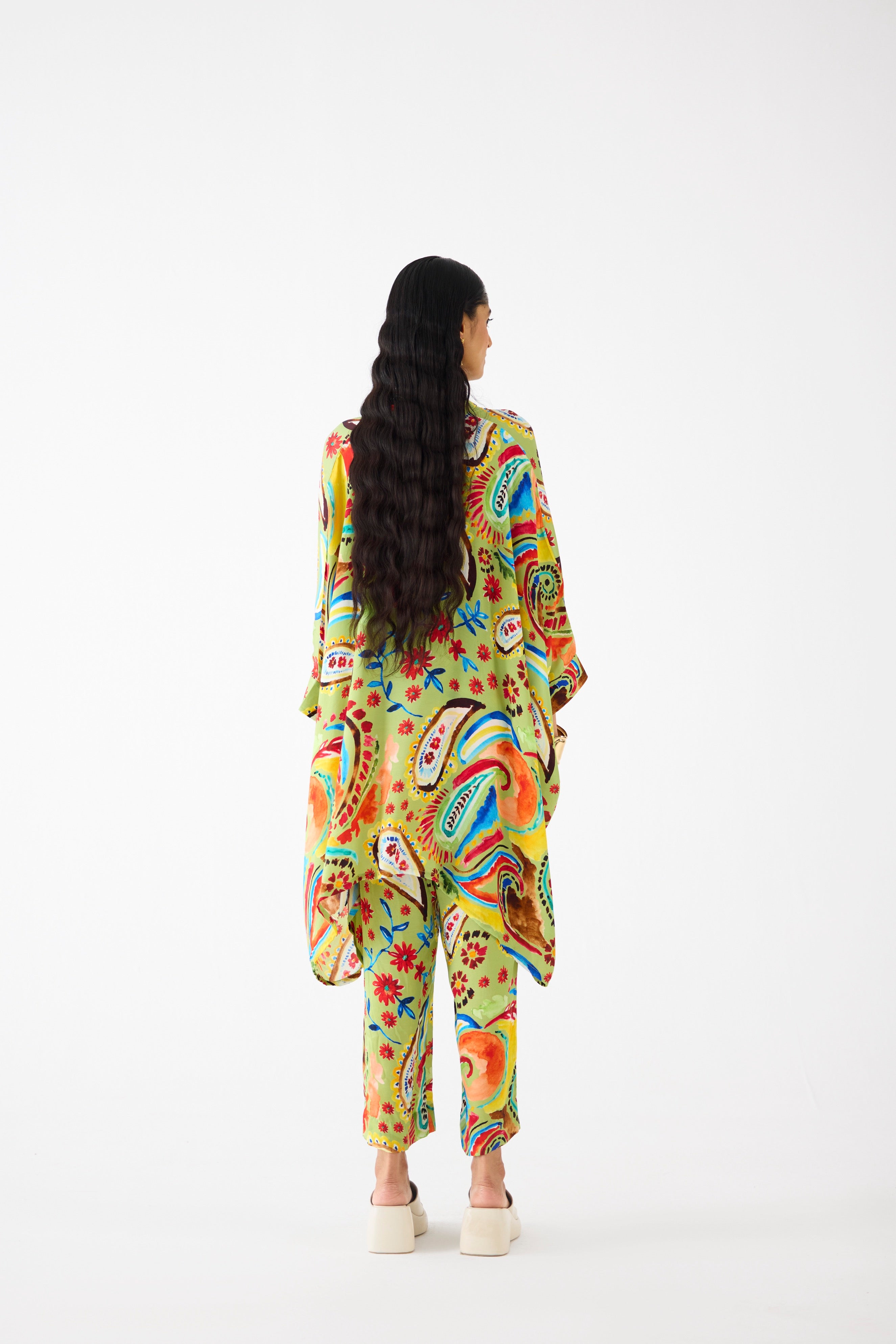 The Antella Short Kimono & Pants crafted from our stunning vegan silk fabrication, trans-seasonal, is a statement piece. This co-ord, digitally printed in our hand drawn Antella multi motif floral print has a relaxed fit. With Kimono sleeves , the piece has front shell buttons and a collar. Featuring a formal look, it is paired with our Antella trousers with a waistband and pockets. Wear it with heels for an elegant look.