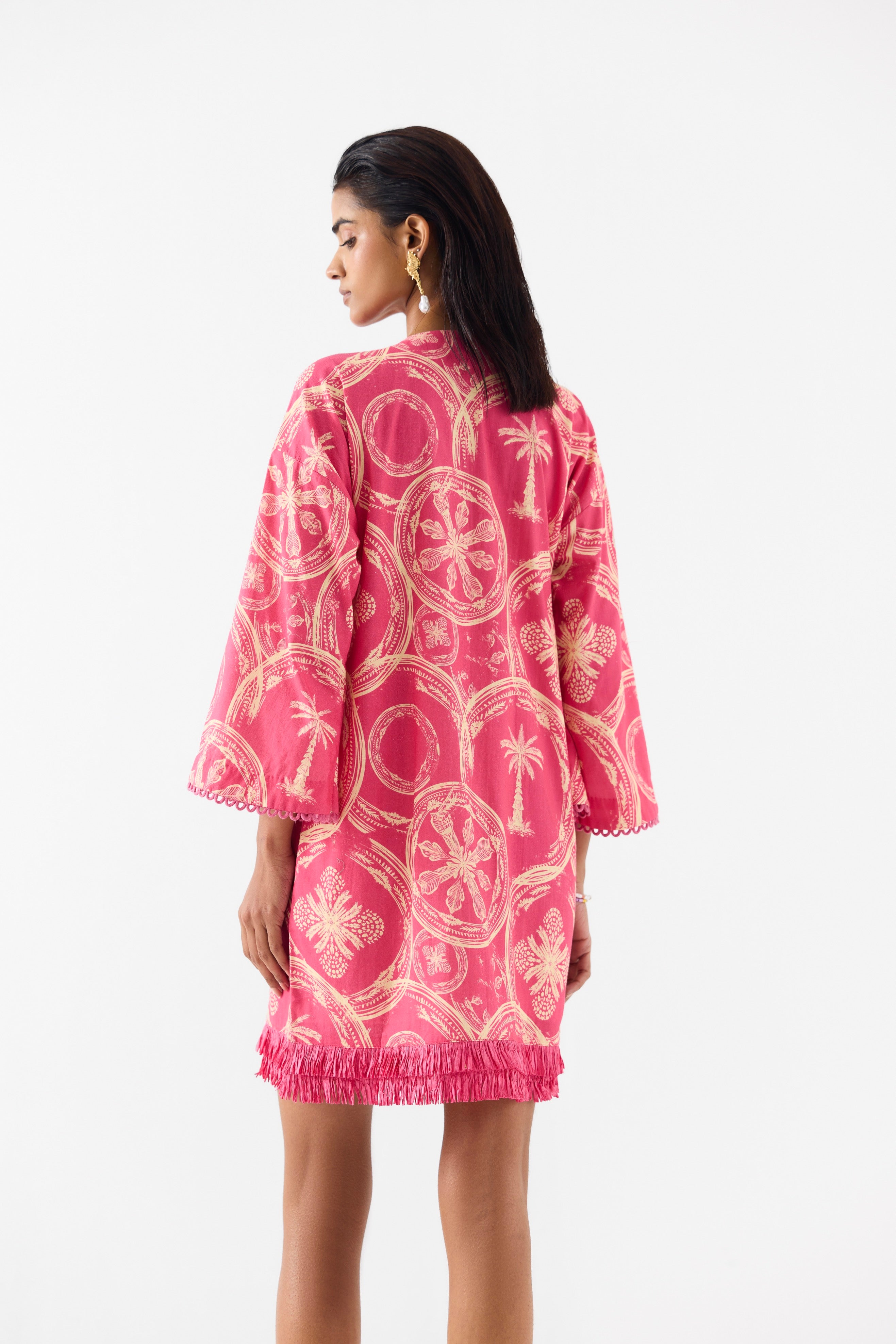 The Areca Palm Bell Sleeves Dress crafted from our stunning cotton fabrication, trans-seasonal, is a statement piece. Made in our 100% cotton slub in our areca palm print, this dress has a v-neckline and bell sleeves. Featuring an a-line look, it has strings in the front with shell tassles. With pockets on the side, this piece has a relaxed look and can be styled in different ways. It also has raffia atttached at the bottom hem. It can be Paired with heels for a festive look.