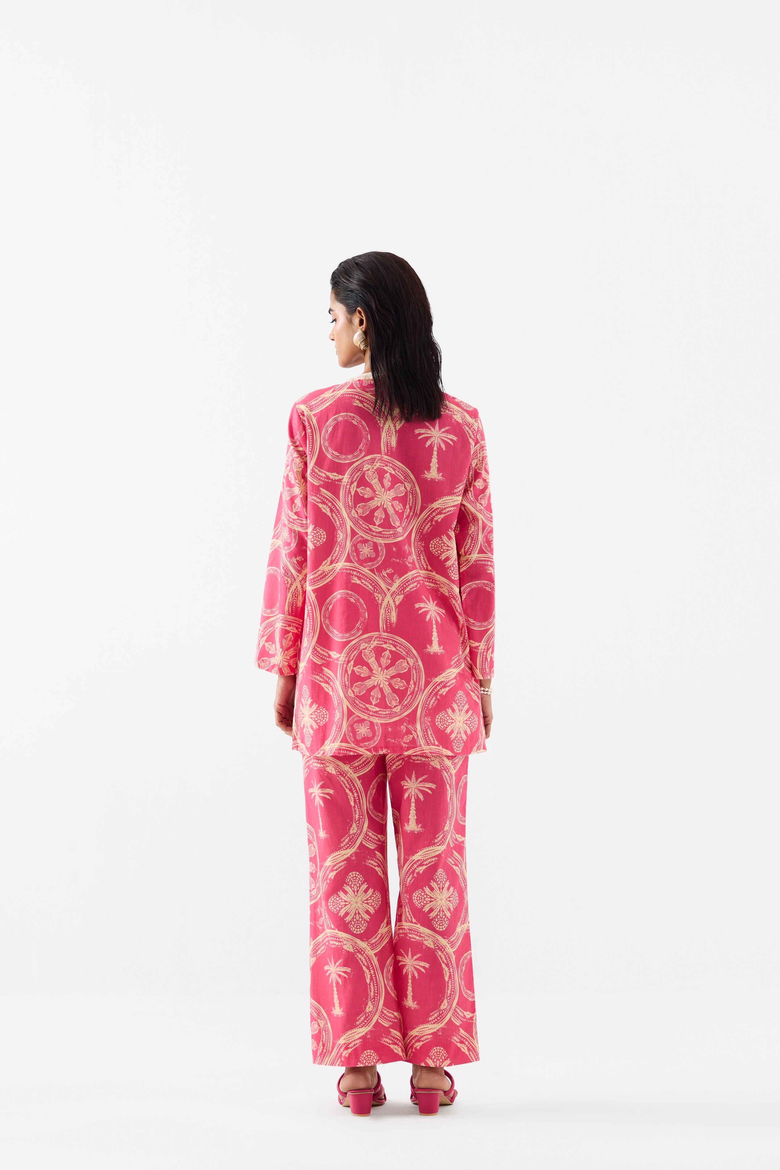 The Areca Short Kurta and Pants crafted from our 100% cotton fabrication, trans-seasonal, is a statement piece. The kurta, made in our areca palm print, is part of a 2 piece set. With a hand embroidered neckline, this kurta is lined and has full sleeves. Featuring a summery look, it has high slits. Paired with our Cabana printed straight pants with a side zipper, it looks chic. Wear it with heels for an elegant look.