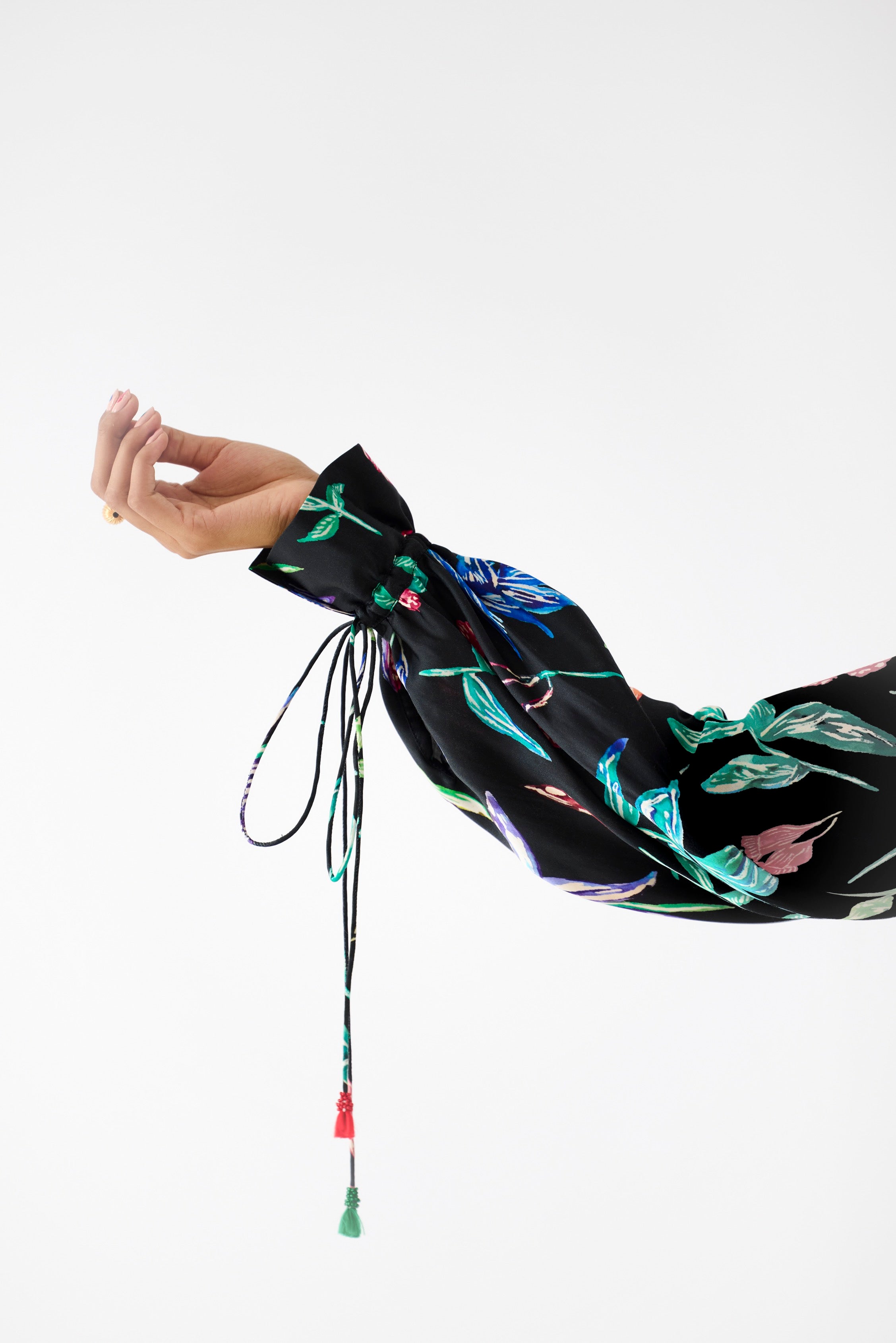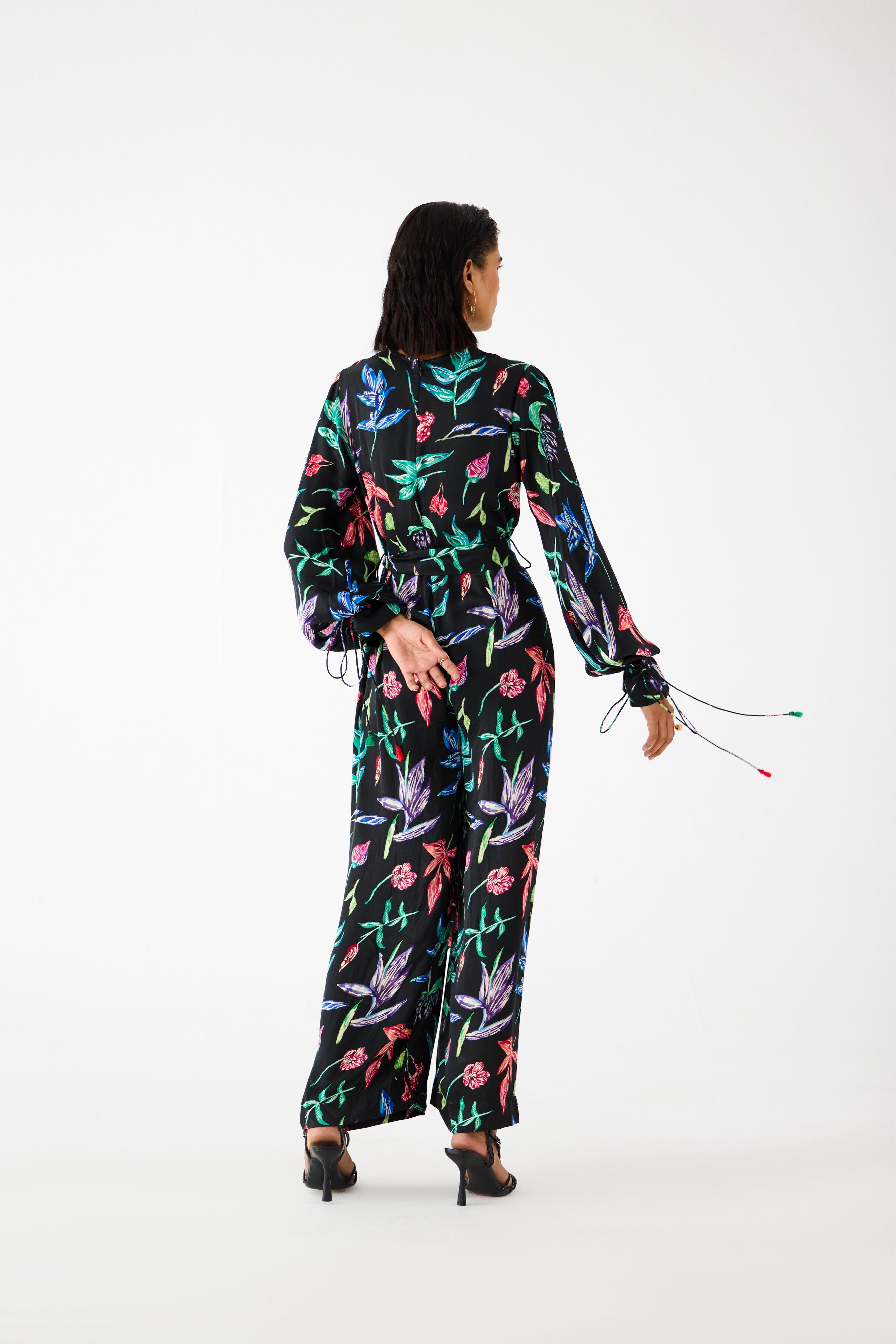 The Black Botanica Jumpsuit crafted from our stunning vegan silk fabrication, trans-seasonal, is a statement piece. This jumpsuit, digitally printed in our hand drawn Botanica floral print has a centre back zipper. With drawstring sleeves, this jumpsuit has a cross over neckline. It has full sleeves, a belt and tassel details. Wear it with heels for an elegant look.