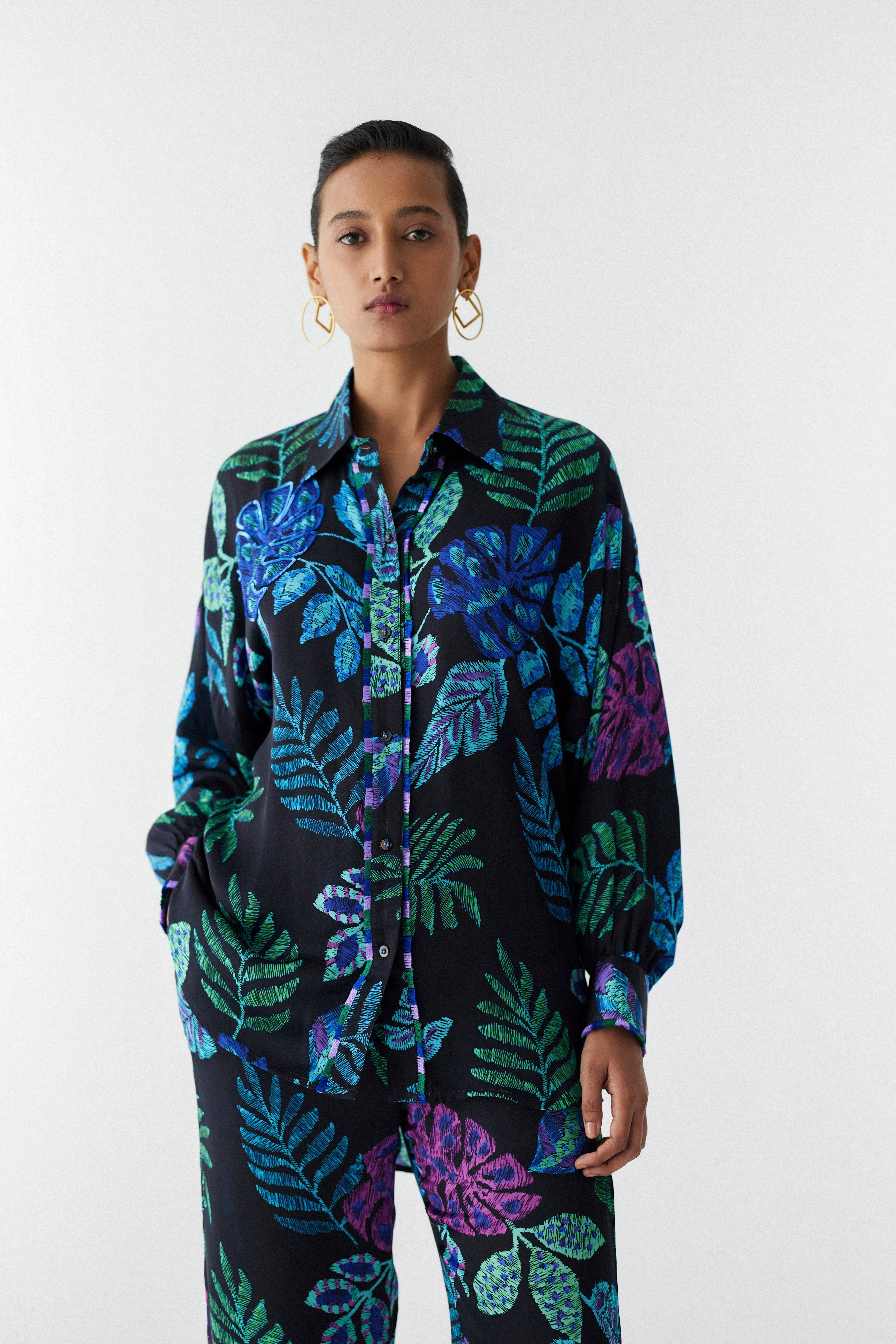 The Black Jungle Shirt & Pants Co-ord crafted from our stunning Vegan silk fabrication, trans-seasonal, is a statement piece. Made in our hand-drawn Amazon forest inspired Black Jungle print, this has multi-color fringe detailing on the placket. Featuring a front opening, this piece has a relaxed silhouette and can be styled in different ways. Paired with matching trousers with a centre zipper and Pockets. Wear it with heels for an elegant look.