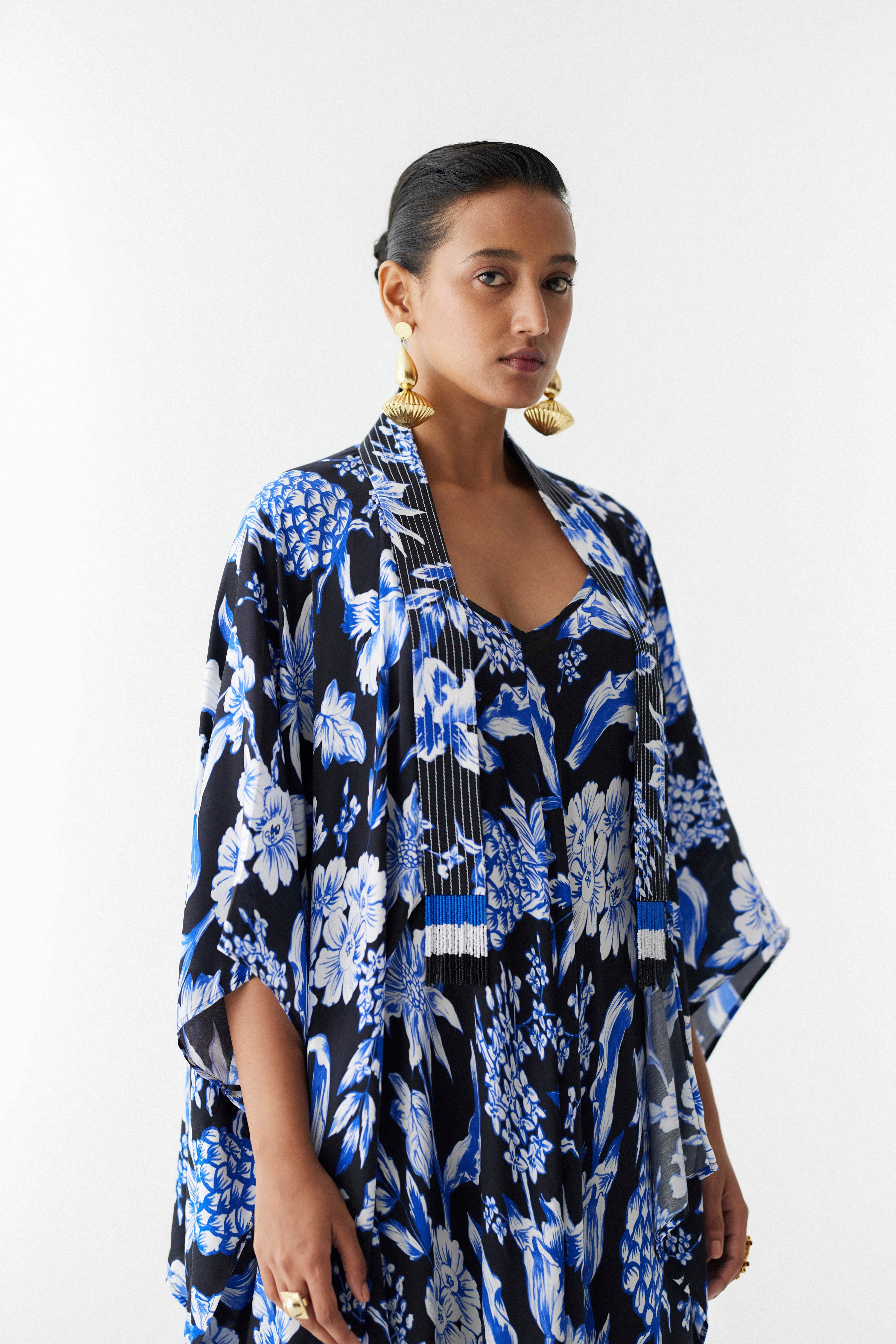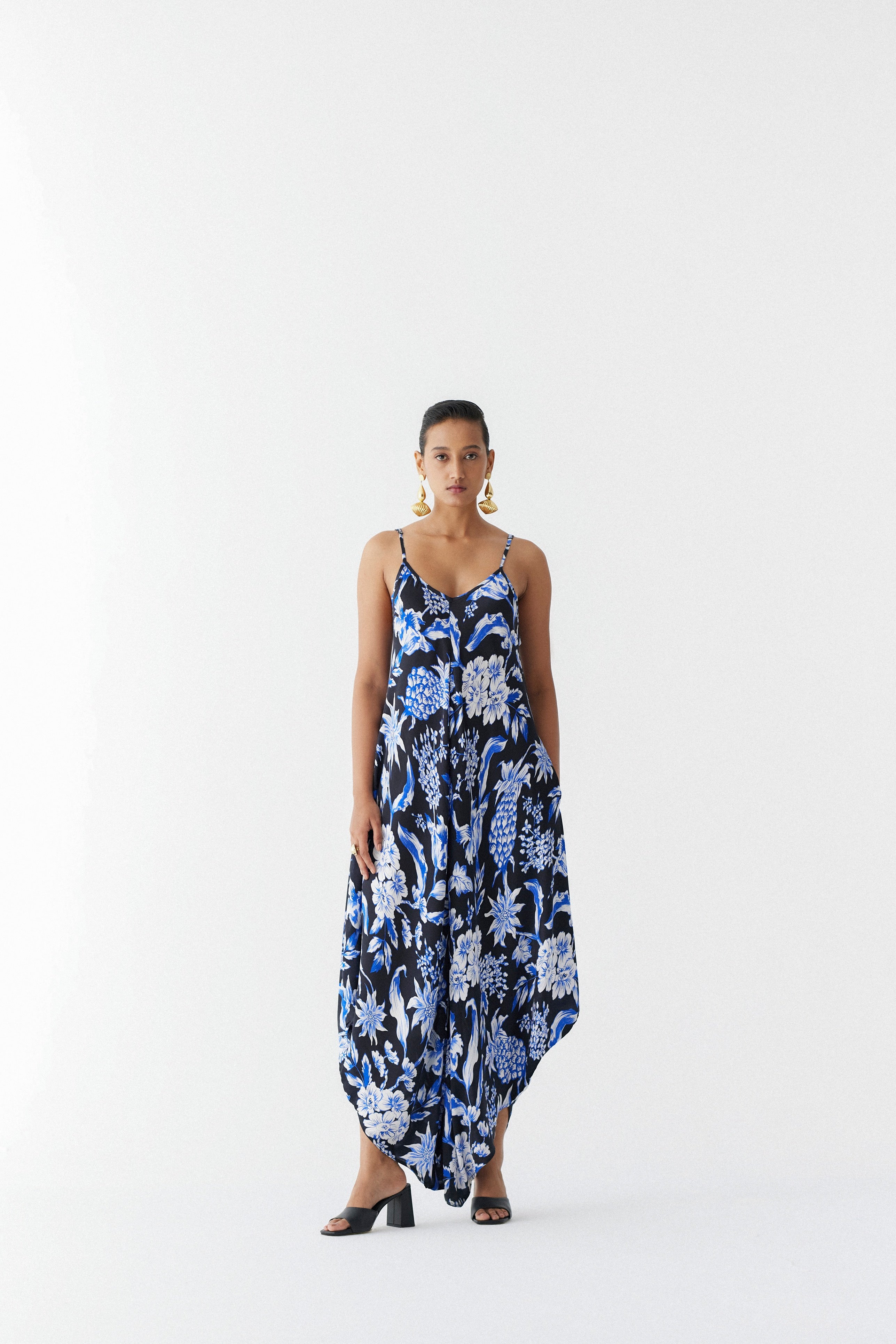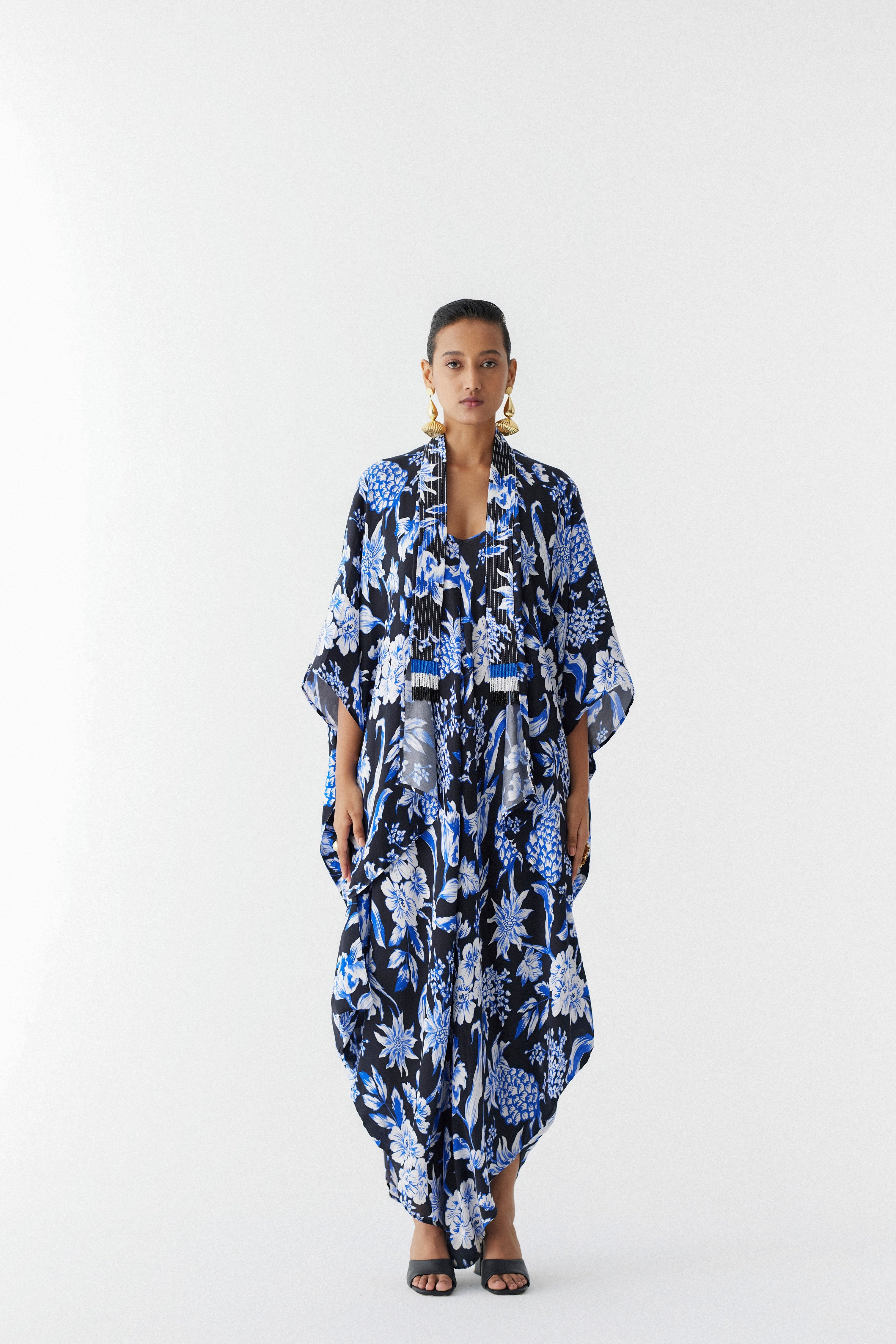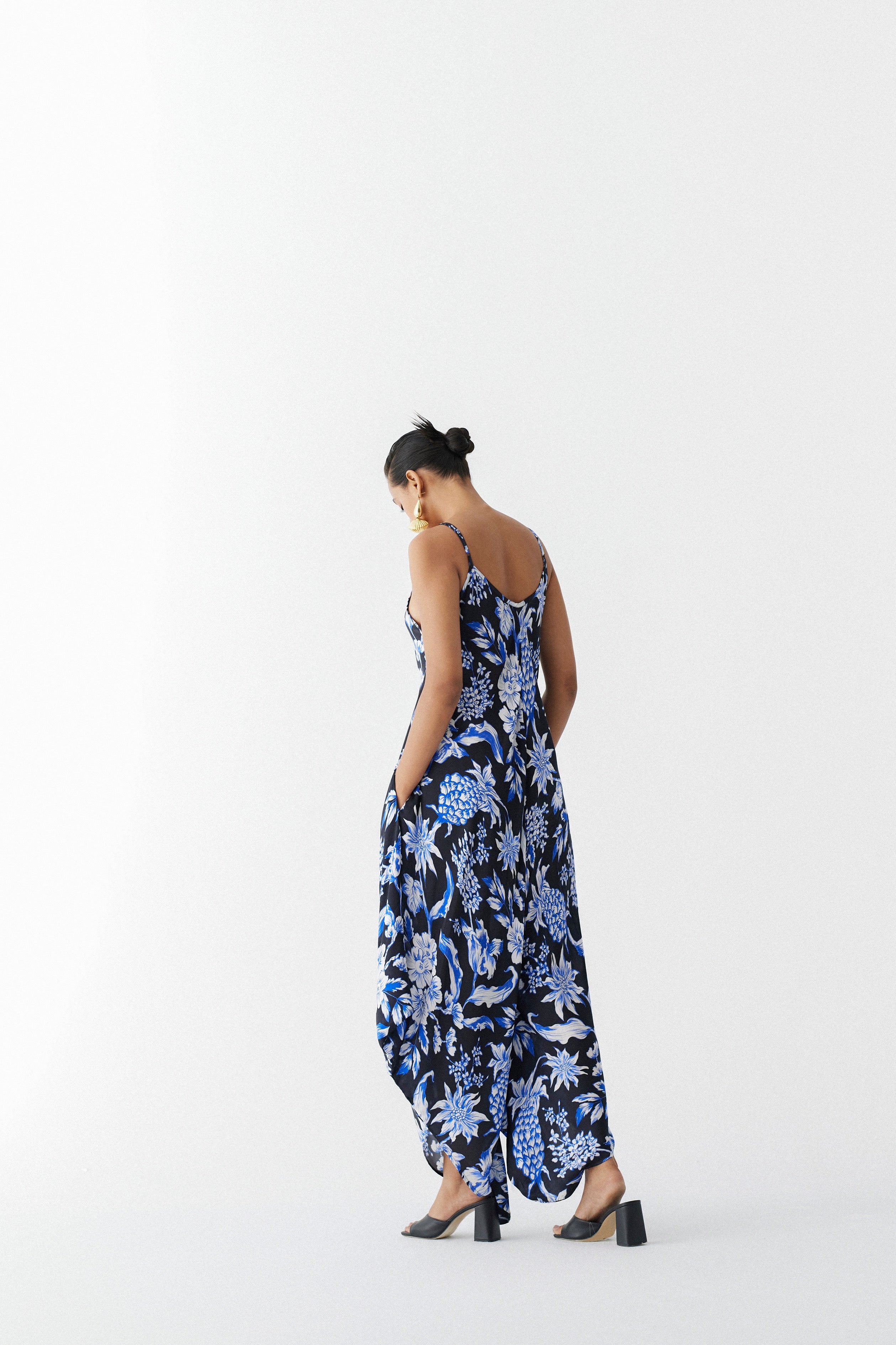 The Black Pineapple Strappy Jumpsuit & Cape Co-ord crafted from our stunning Vegan silk fabrication, trans-seasonal, is a statement piece. Made in our Black Hand Drawn Pineapple print, this has hand embroidered beads hanging from the collar. Featuring a relaxed Strappy jumpsuit with pockets, this piece asymmetric hem and can be styled in different ways. The cape is free size and has top stitching detailing on the collar. Wear it with heels for an elegant look.
