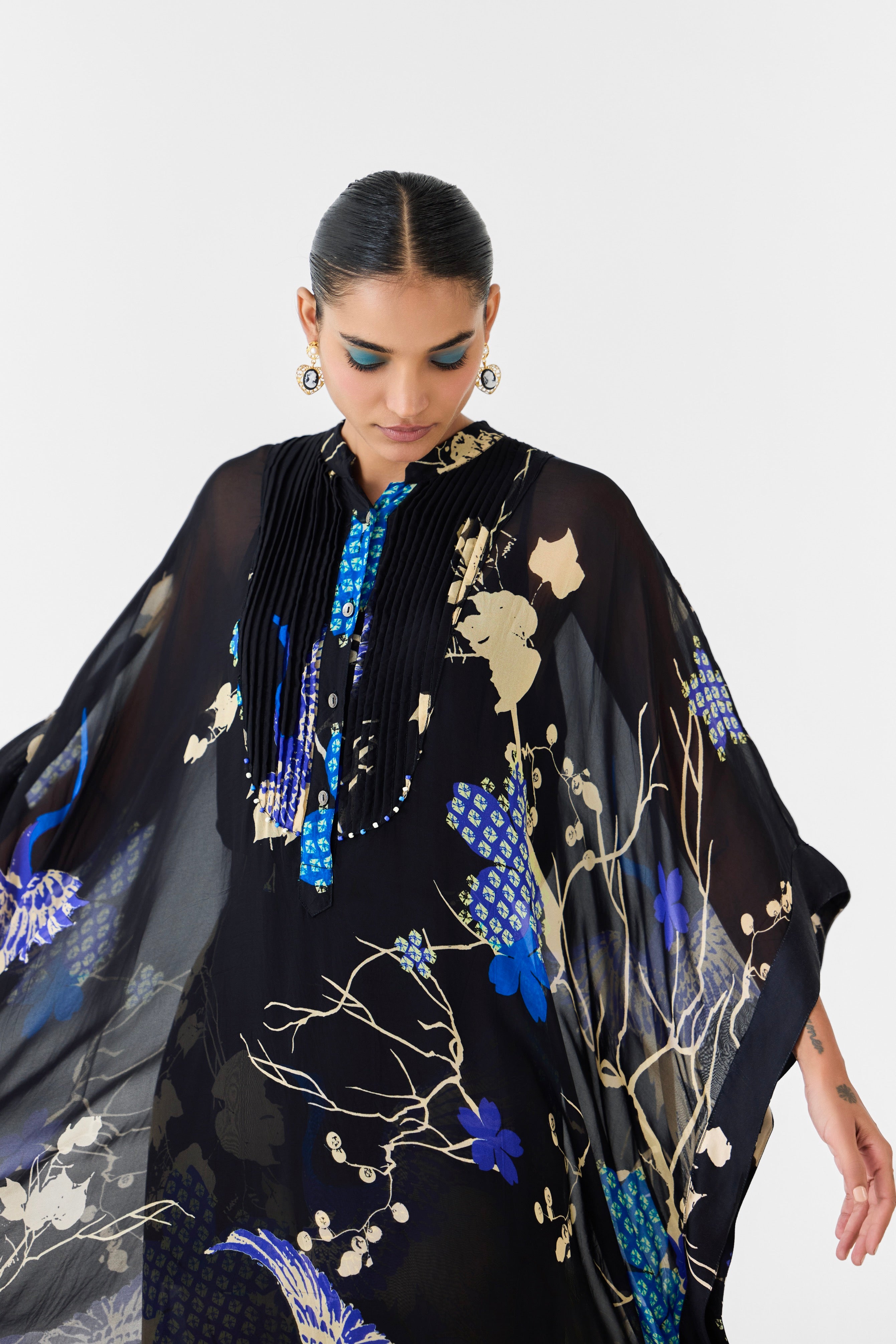 The Black Crane Organza Kimono & Pants Co-ord crafted from our stunning Organza fabrication, trans-seasonal, is a statement piece. The piece, made in our digitally printed crane & shibori print, has pintucks on the front yoke. With a chinese collar, the kimono is FS. It comes with a black crepe slip. It is paired with our matching Crane organza trousers. Wear it with heels for an elegant look.