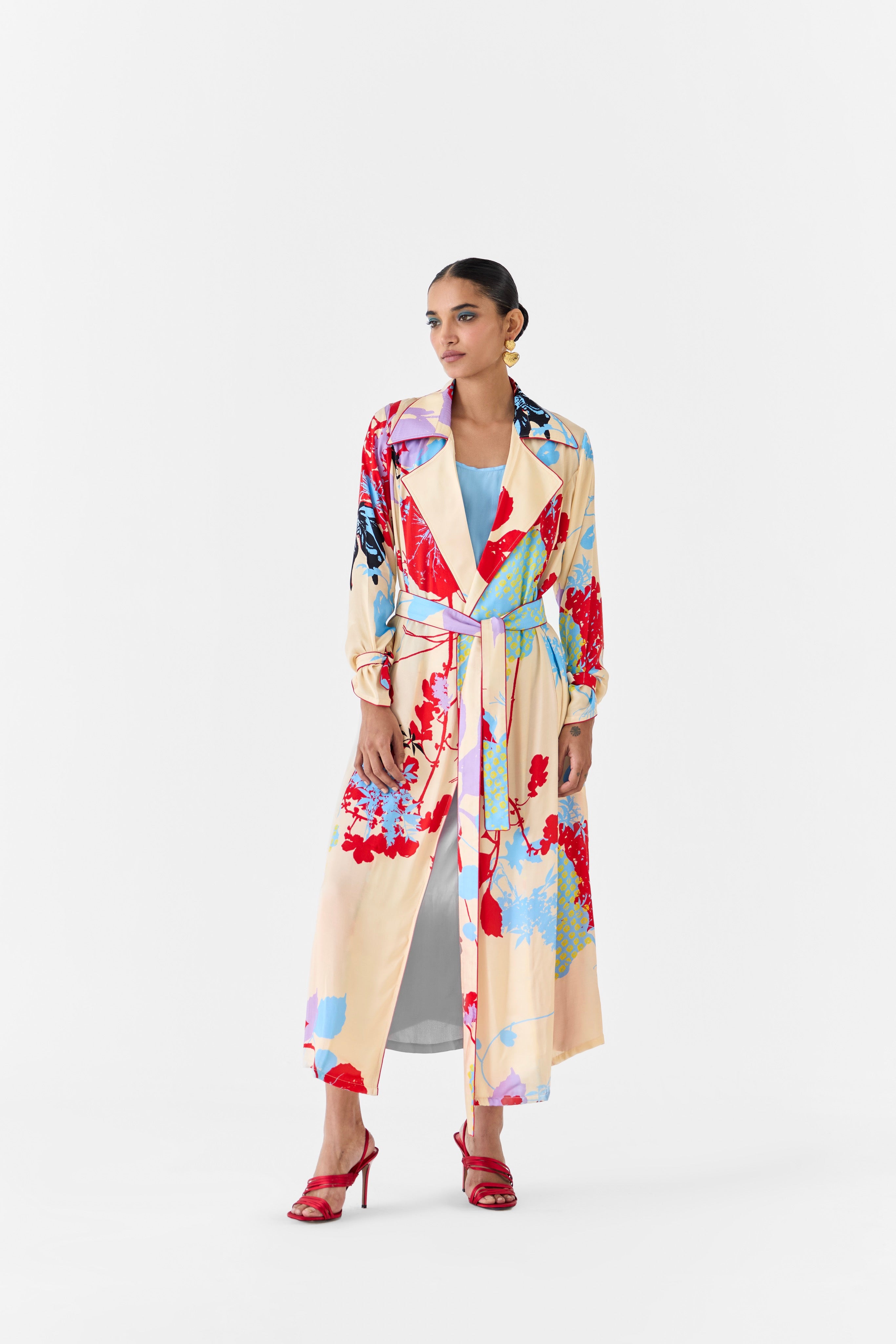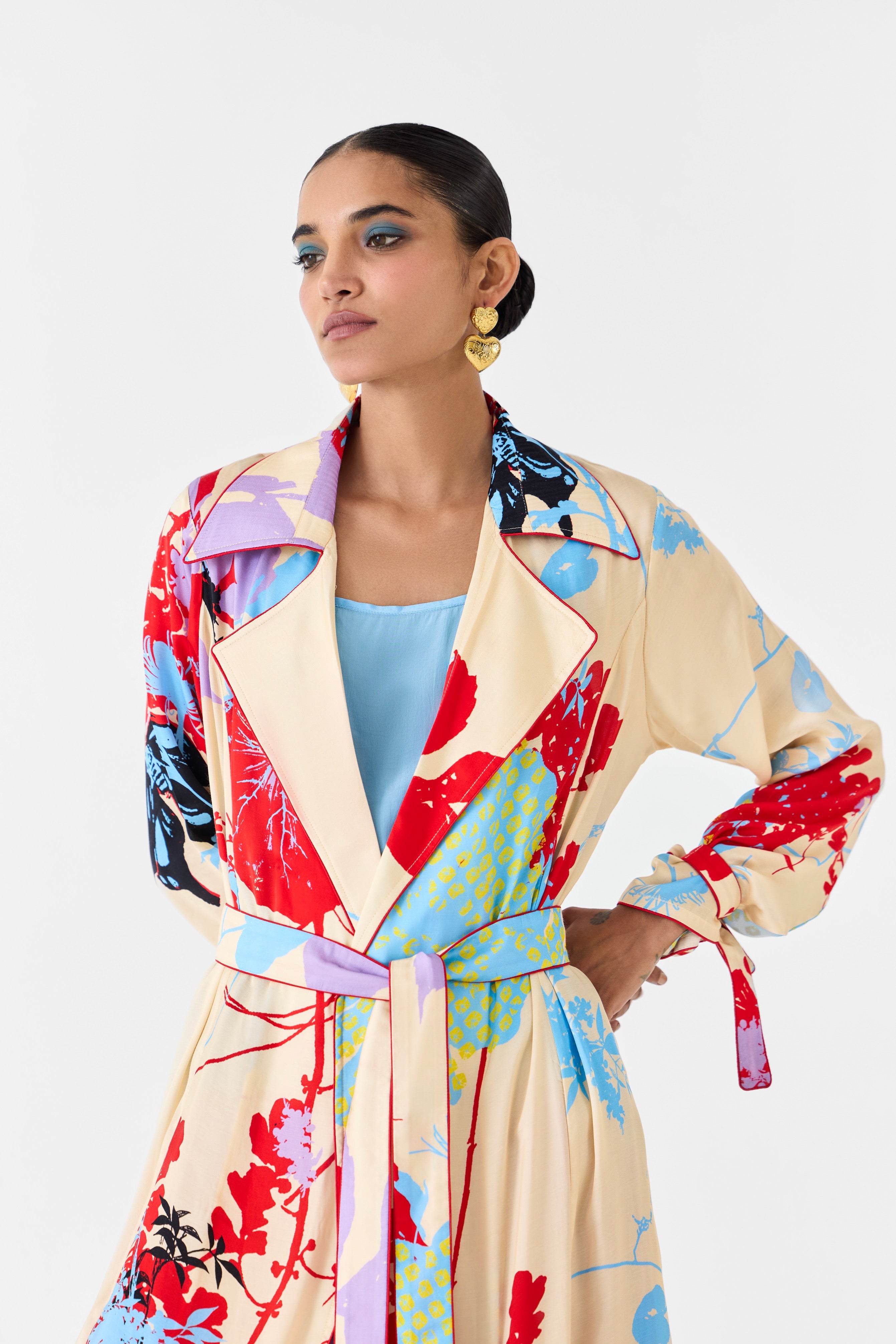 The Cream Ikigai Trench Coat & Trousers Co-ord crafted from our stunning Vegan Silk fabrication, trans-seasonal, is a statement piece. The piece, made in our digitally printed shibori and ikigai print, has a straight fit. The trench coat has piping and comes with a belt. It is paired with a contrast ombre slip in crepe. Wear it with heels for an elegant look.