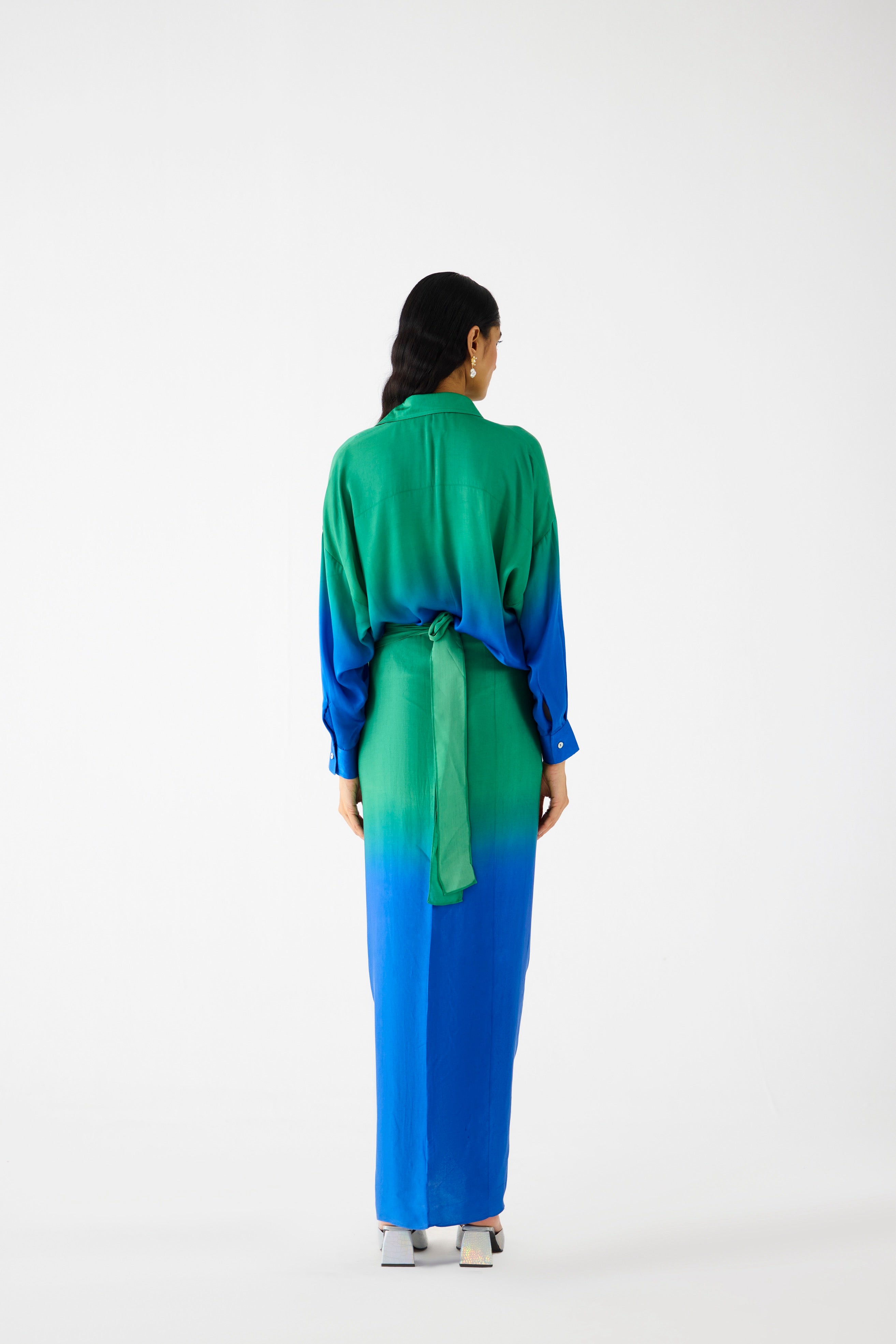 The Emerald Shirt Draped dress crafted from our stunning Vegan Silk fabrication, trans-seasonal, is a statement piece. The piece, made in our hand dyed cupro, is a one single dress. With tie ups at the waist, this dress in bottle & dark green has a relaxed shirt on top and attached skirt at the bottom. Featuring a draped skirt, this piece can be tied with a knot and can be styled in different ways. Wear it with heels for an elegant look.