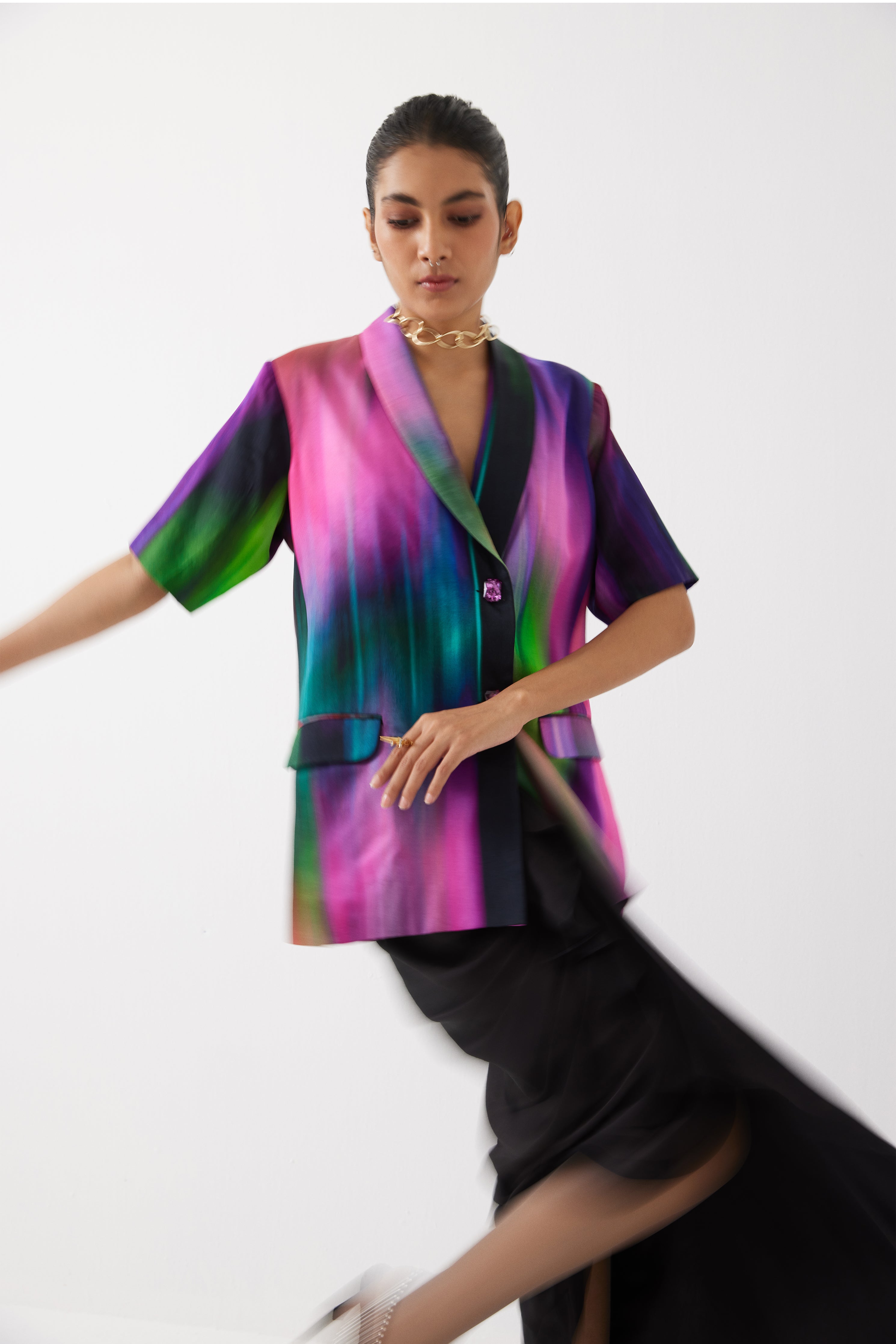 The Milky Way Blazer & Draped Skirt Co-ord is crafted from our stunning vegan silk fabrication. Made in our stunning hand painted milky way print, this is a trend setting piece. Featuring a straight fit blazer with half sleeves, this piece is versatile and paired with a sexy black draped skirt. The blazer has a front opening with Swarovski buttons and the skirt is draped. Pair it with heels for an elegant look.