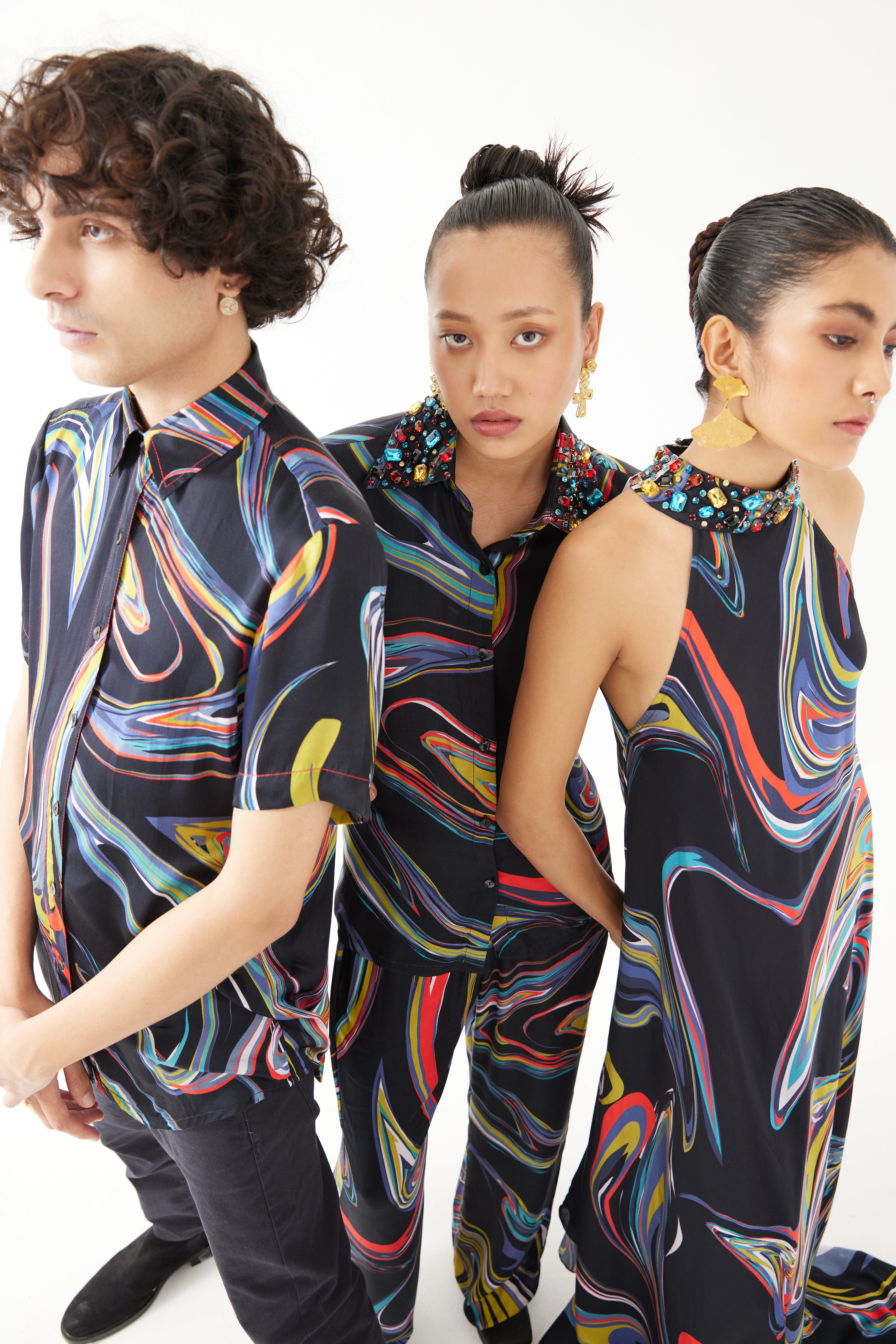The Galaxy Half Sleeve Men's Shirt crafted from our stunning vegan silk fabrication, trans-seasonal, is a statement piece. Made in our Hand painted galaxy print, this is a trend setting piece. Featuring a front opening and half sleeves, this men’s shirt is trendy and can be styled in different ways. Pair it with jeans for a formal look.
