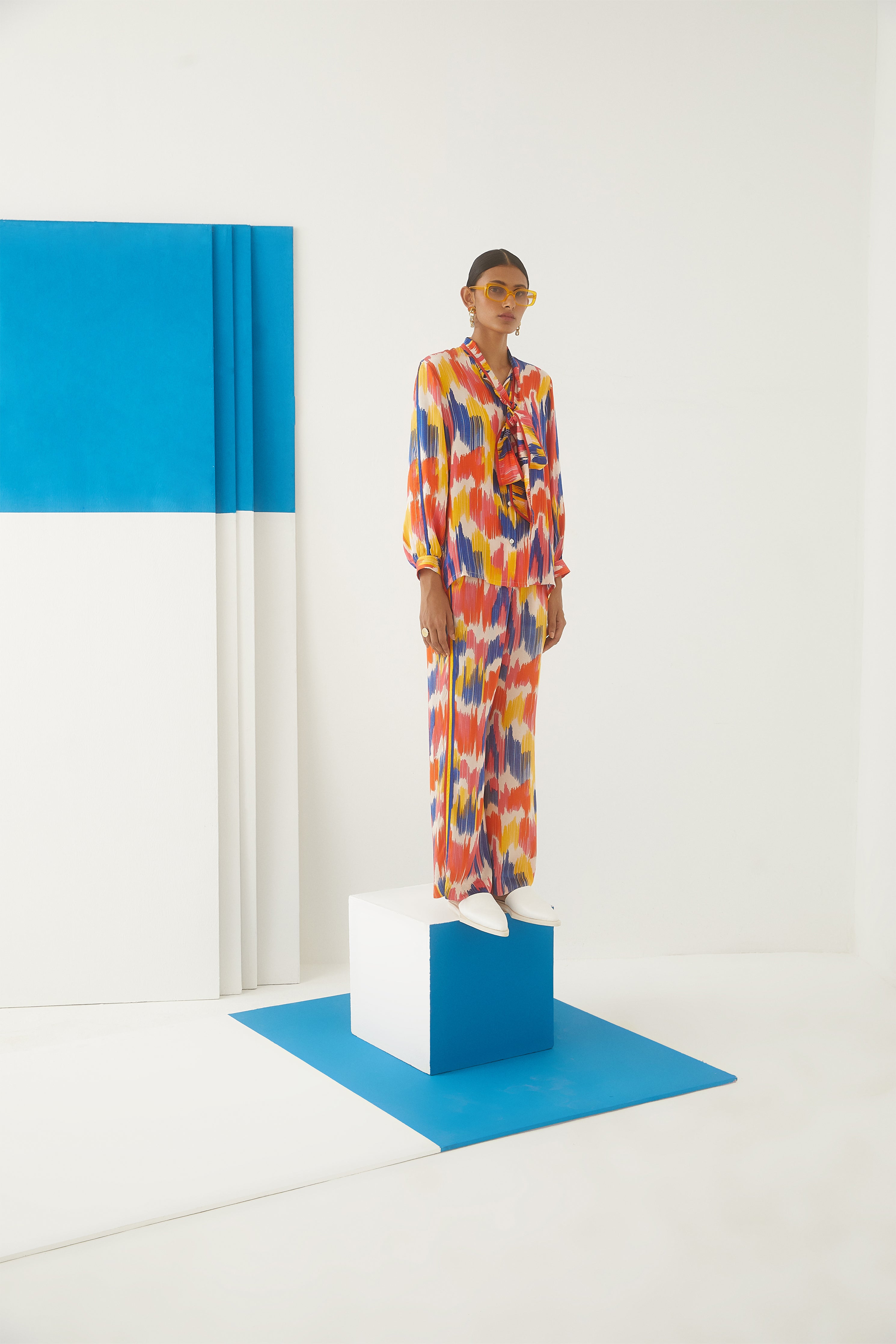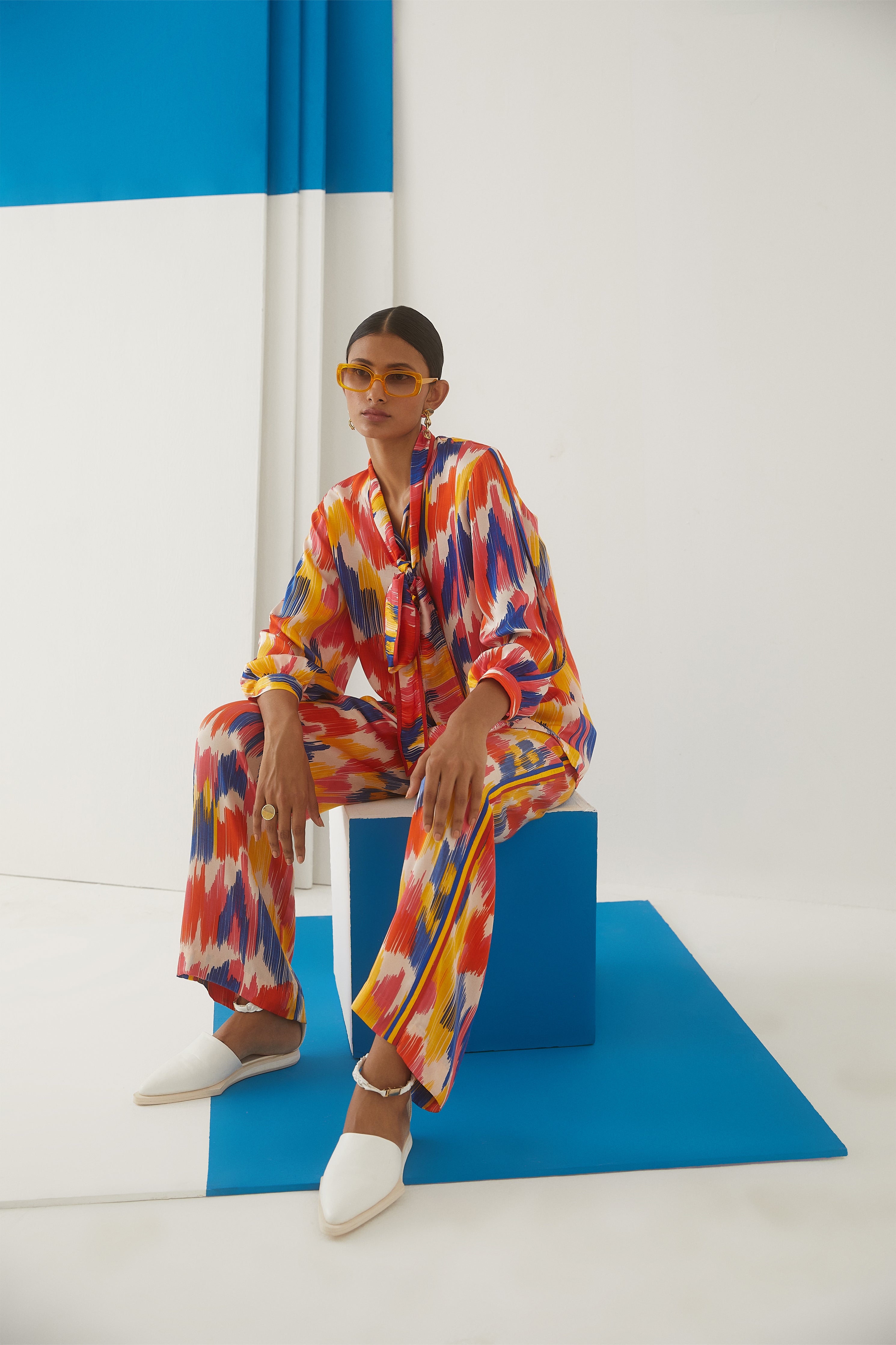 The Ikat Knot Shirt & Trousers Co-ord crafted from our stunning vegan silk fabrication, trans-seasonal, is a statement piece. Made in our Ikat Check Print, this is a trend setting piece. Featuring a straight shirt with sleeve slits and contrast piping, this piece is versatile and has a front opening with a knot. It is paired with matching ikat trousers with piping on the side. Pair it with heels for a festive look.