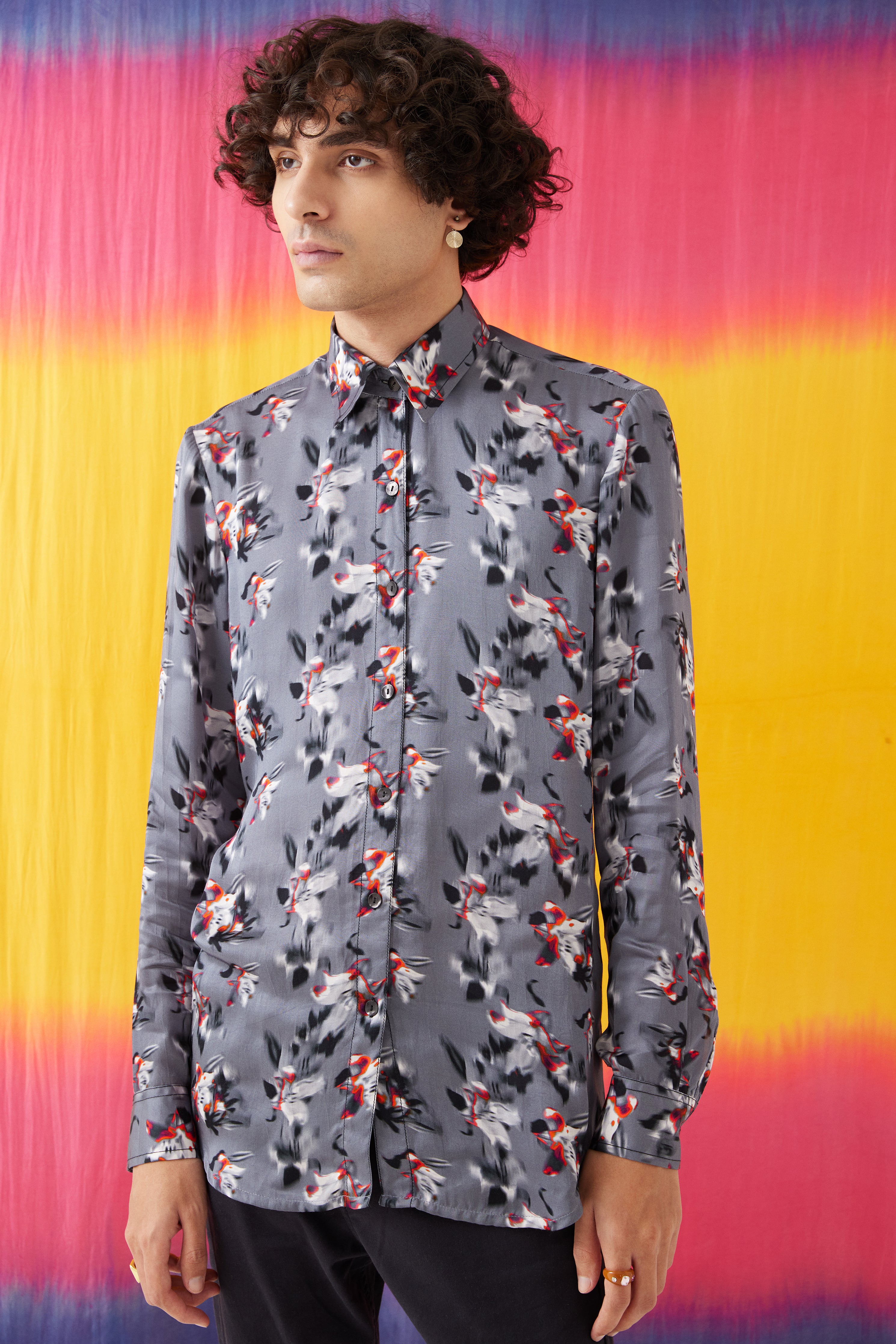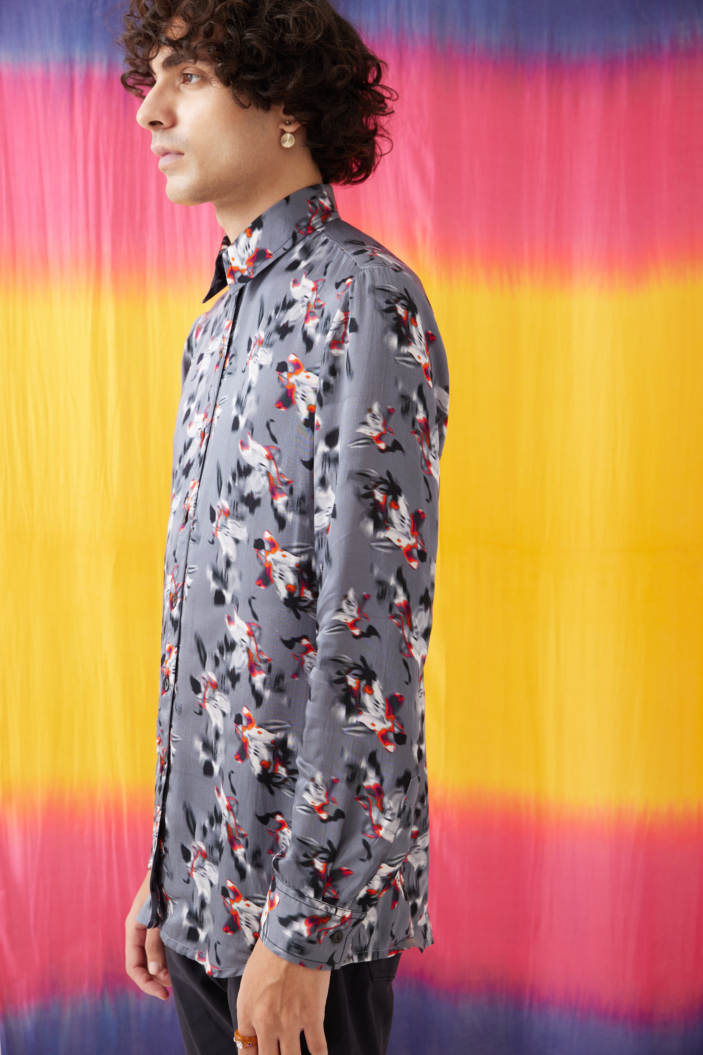 The Iris Men's Shirt crafted from our stunning vegan silk fabrication, trans-seasonal, is a statement piece. Made in our Iris flower abstract print resembling a hand painted floral motif, this is a trend setting piece. Featuring a front opening and full sleeves, this men’s shirt is trendy and can be styled in different ways. Pair it with jeans for a formal look.
