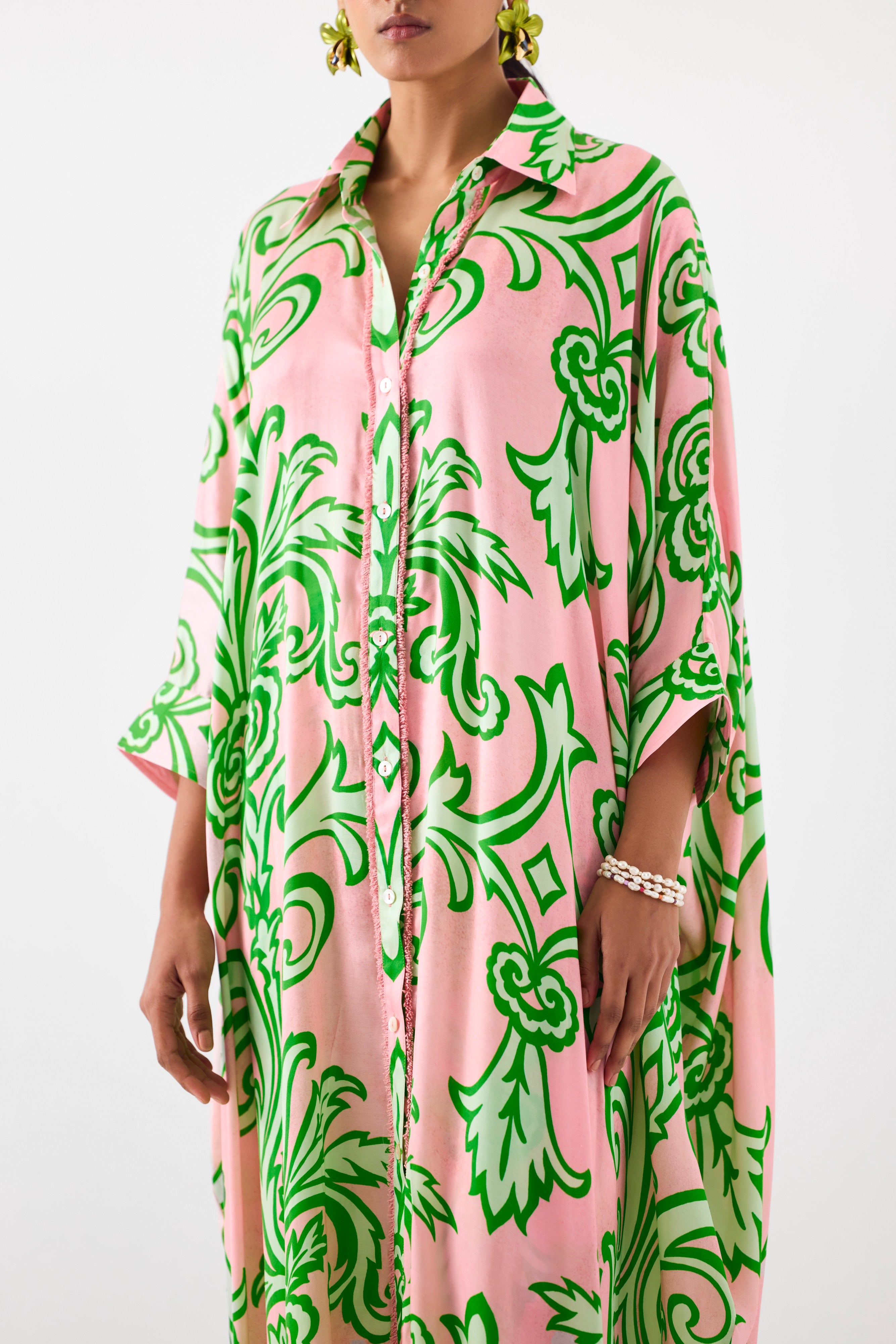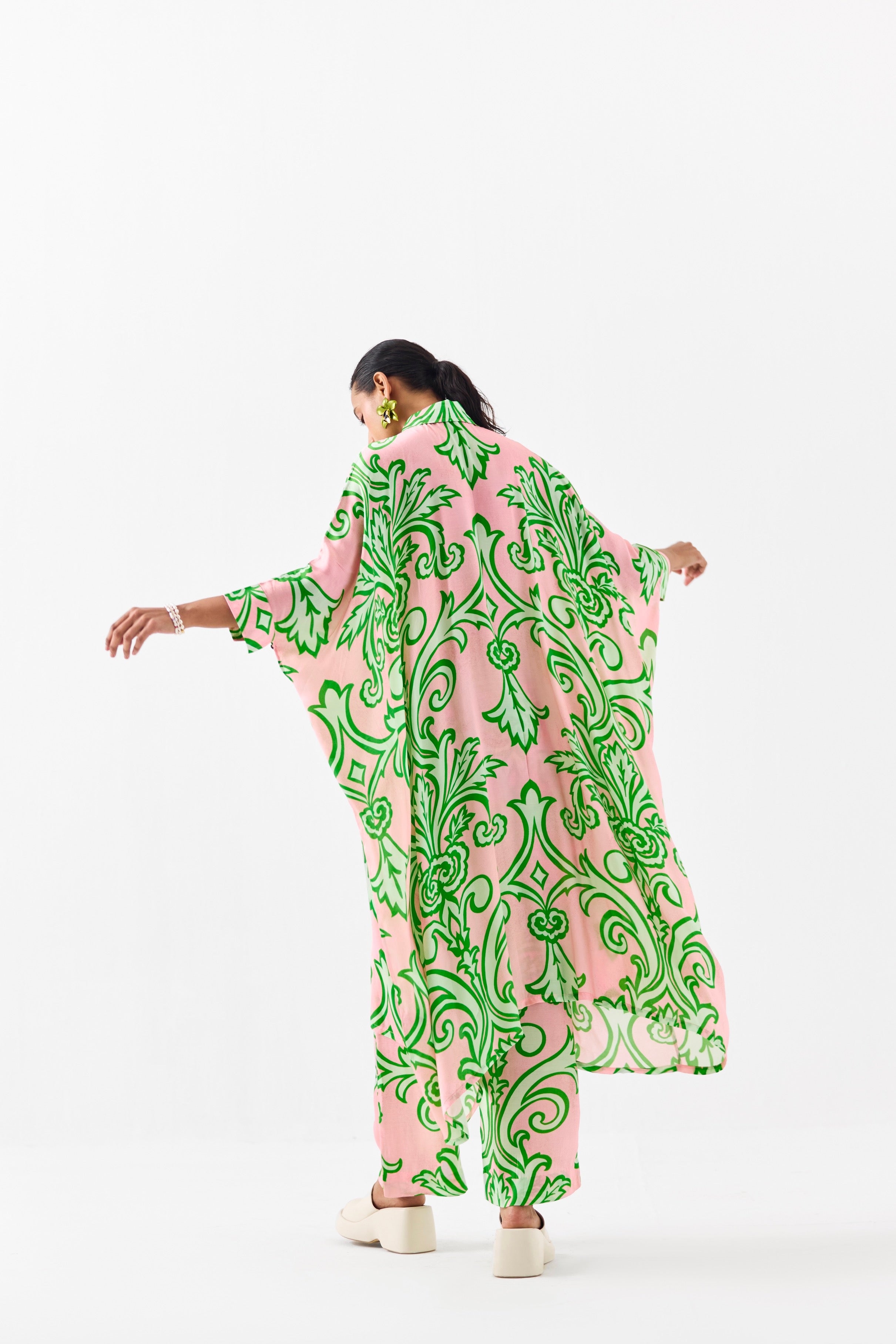 The La Paz Front Button Kimono Kurta and Pants crafted from our stunning Vegan Silk fabrication, trans-seasonal, is a statement piece. The piece, made in our digitally printed baby pink Damask print, has a relaxed fit. With a front opening with fringe, the kimono is free size. It is paired with our matching Mojito side zip pants which are elasticated at the back. Wear it with heels for an elegant look.