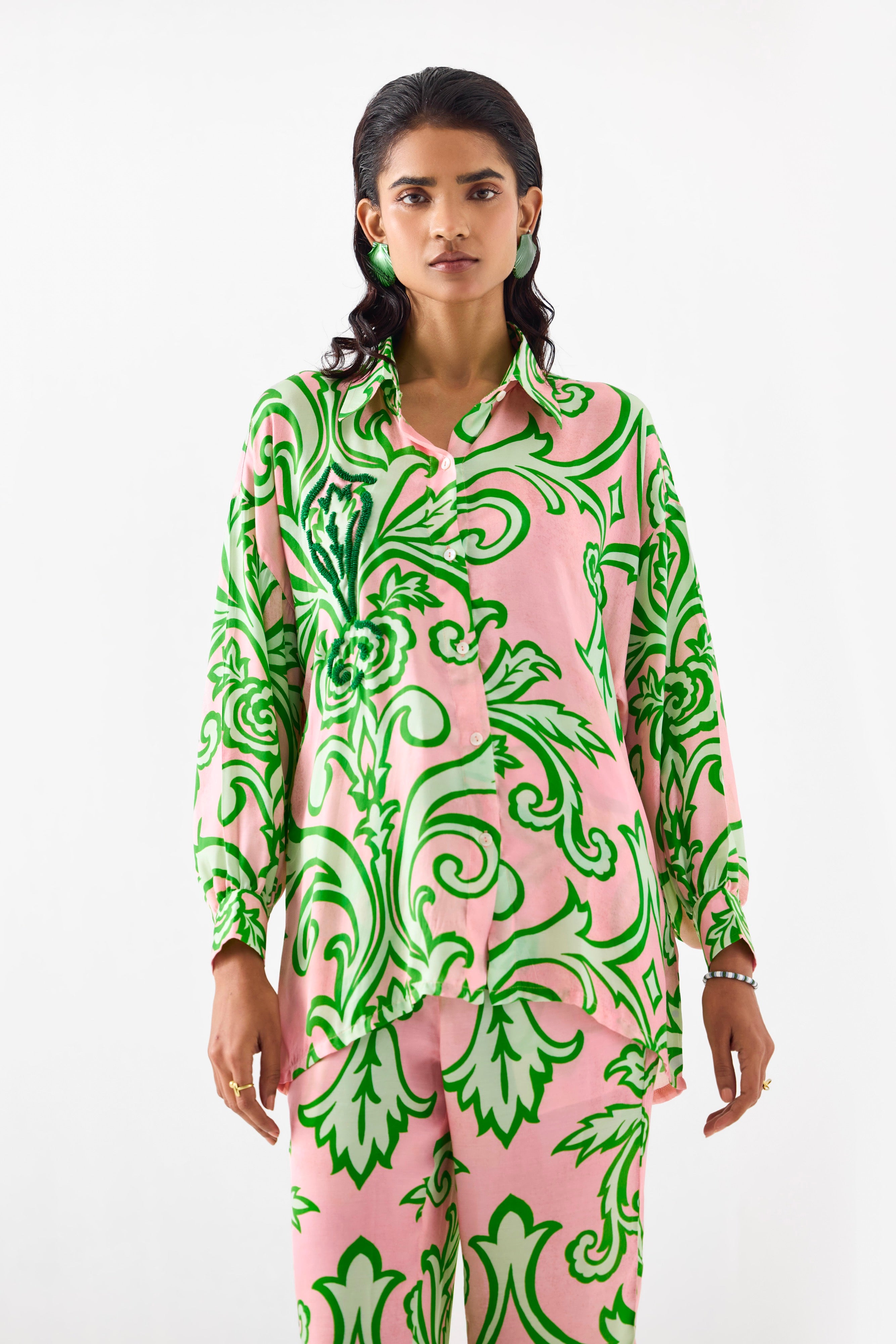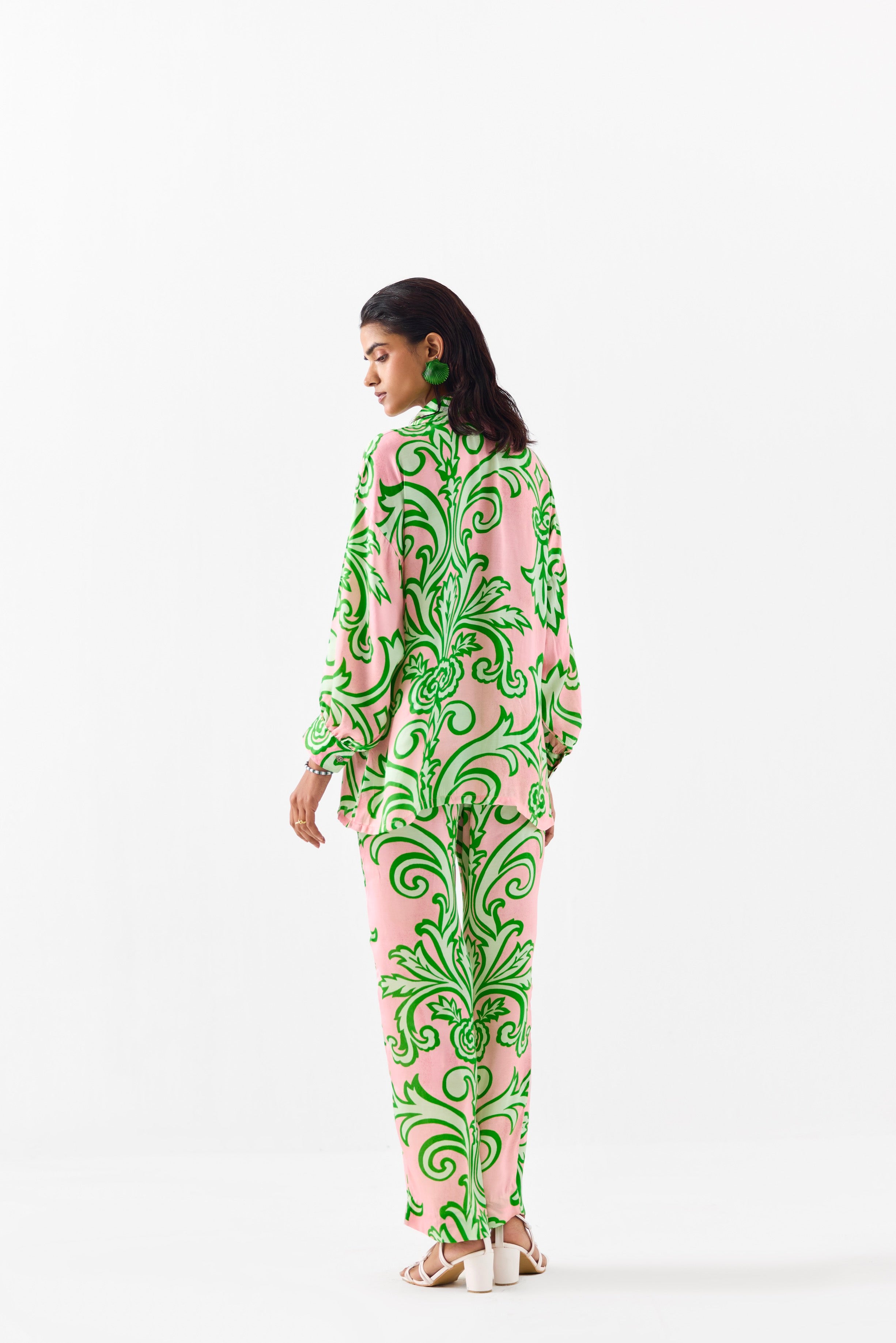 The La Paz Shirt & Pants Co-ord crafted from our stunning vegan silk fabrication , trans-seasonal, is a statement piece. The co-ord, made in our baby pink damask print, has a relaxed fit. With full sleeves , the piece has front shell buttons and hand embroidered sequin patches. Featuring a summery look, it is paired with our Mojito Pants with a waistband and pockets. Wear it with heels for an elegant look.