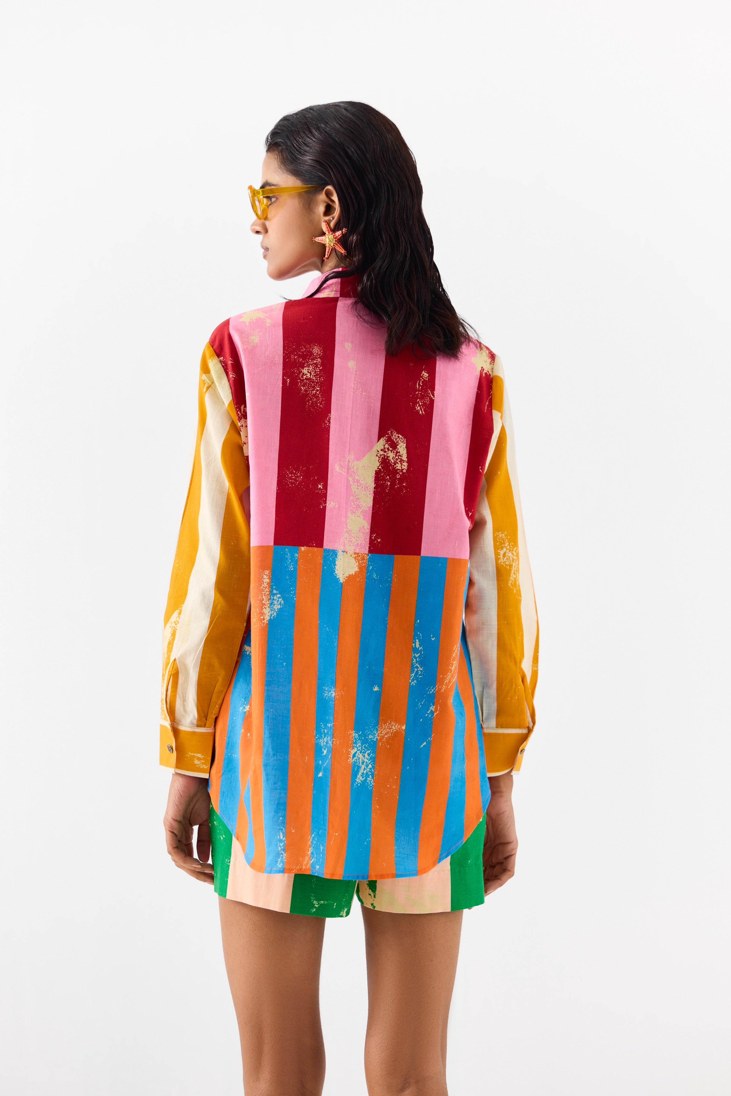 The Long Beach Shirt and Shorts Co-ord crafted from our 100% cotton fabrication, trans-seasonal, is a statement piece. The shirt, made in our Multi color stripes print, is part of a 2 piece set. The shirt has a relaxed fit and has full sleeves. Featuring a summery look, it has gathers on the back. Paired with Long Beach shorts with a front zipper, it looks chic. Wear it with heels for an elegant look.