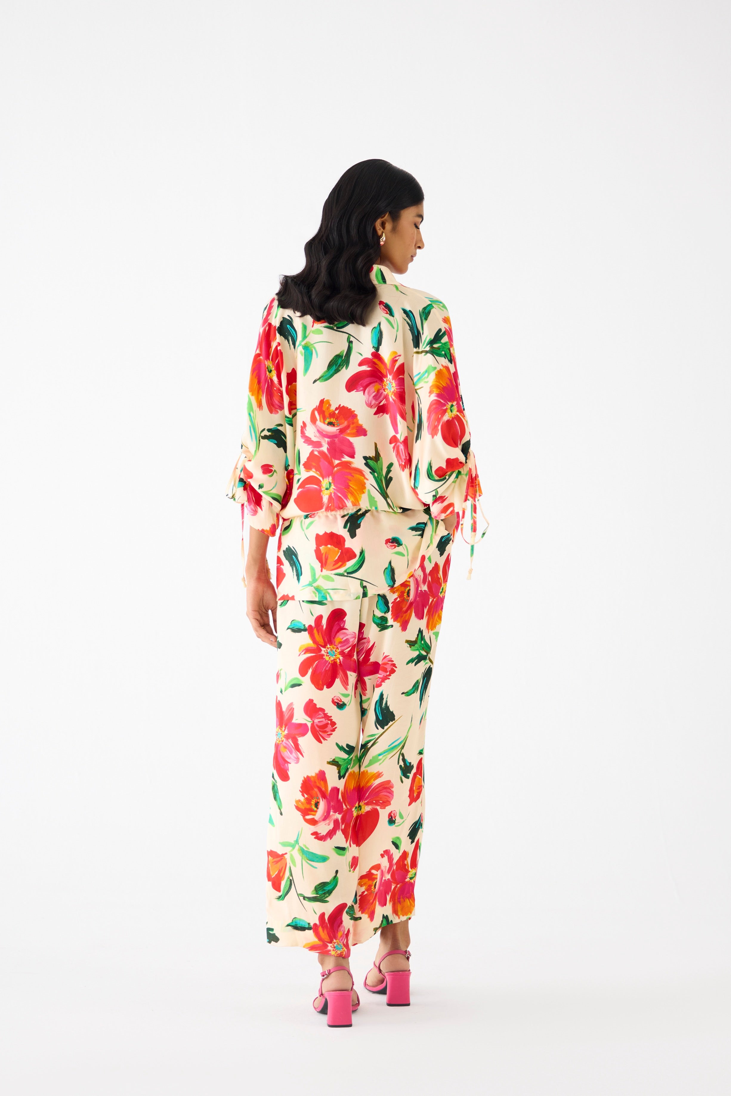The Marjorelle Drawstring Shirt crafted from our stunning vegan silk fabrication, trans-seasonal, is a statement piece. This shirt, digitally printed in our hand drawn acrylic floral print has a relaxed fit. With drawstrings on the waist and sleeves , the piece has front shell buttons and kimono sleeves. Featuring a summery look, it is paired with our Majorelle trousers with a waistband and pockets. Wear it with heels for an elegant look.