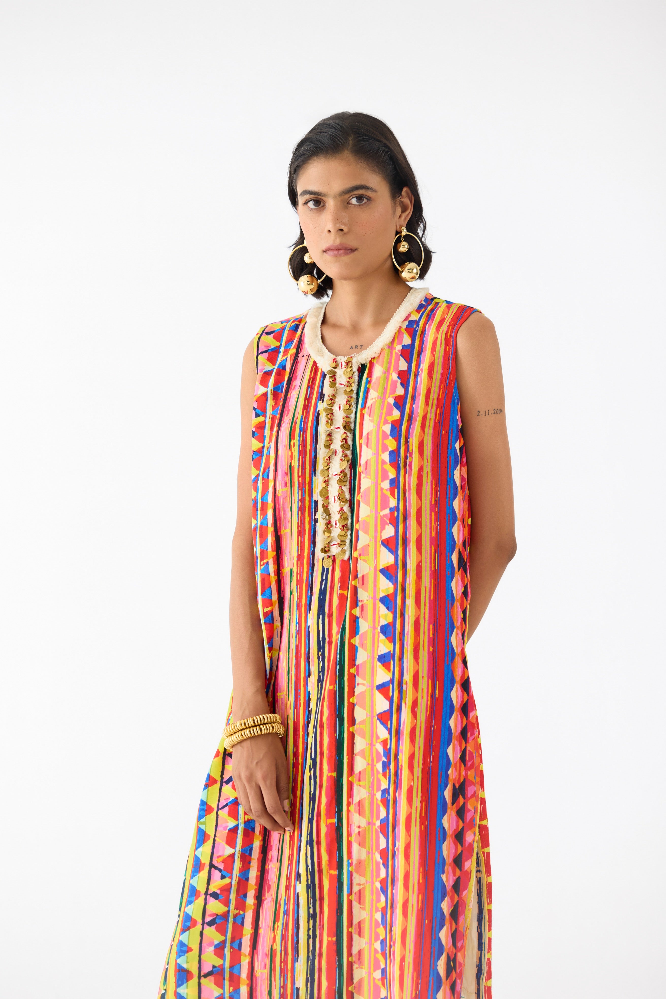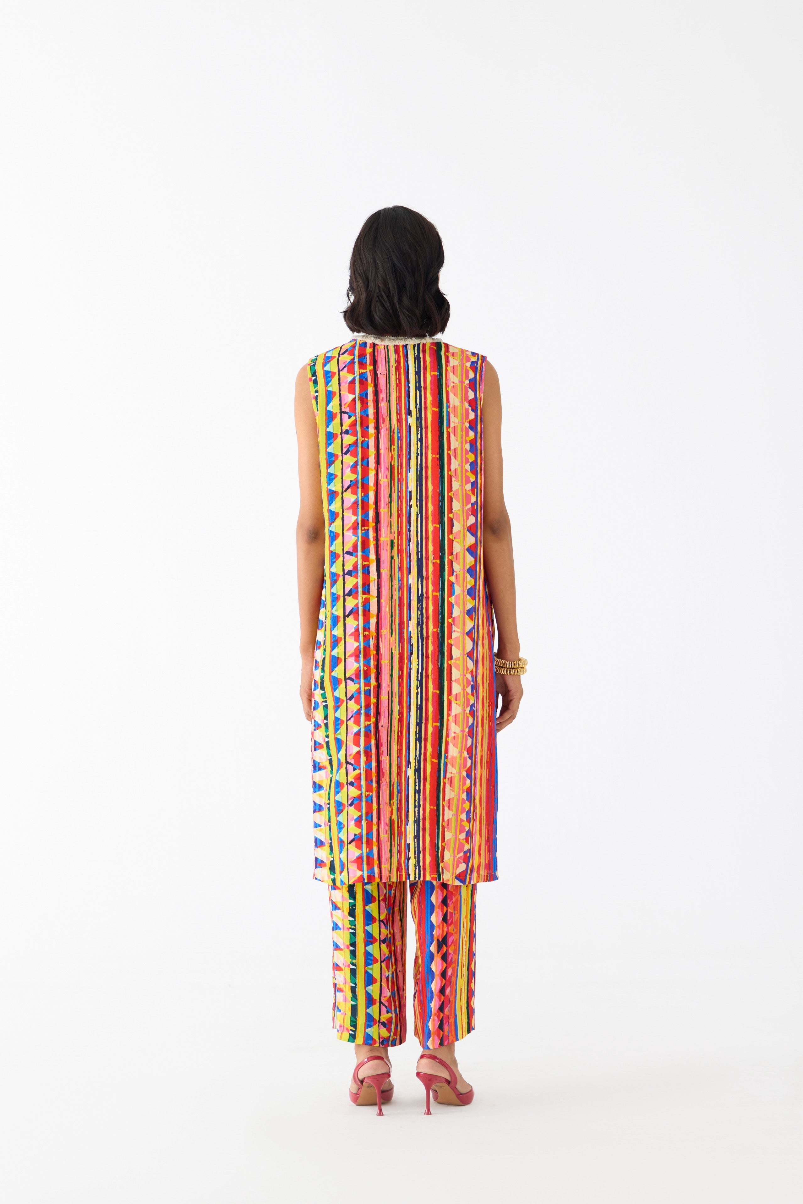 The Marvel Kurta & Pants crafted from our stunning Viscose crepe fabrication, trans-seasonal, is a statement piece. This kurta, digitally printed in our multi colour marvel striped print inspired by ornaments, is part of a 2 piece set. With a hand embroidered neckline, this kurta is lined and is sleeveless. Featuring a summery look, it has high slits. Paired with our Marvel printed straight pants with a side zipper, it looks chic. Wear it with heels for an elegant look.