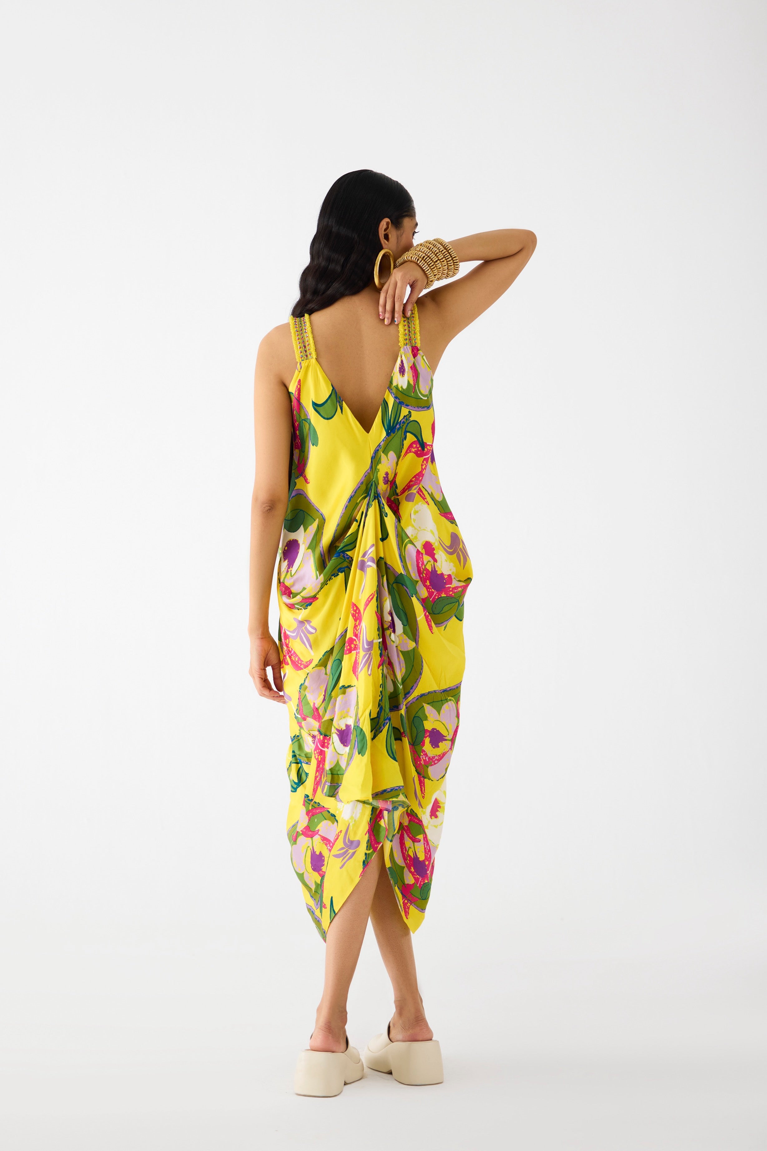 The Paisley Midi Dress crafted from our stunning vegan silk fabrication, trans-seasonal, is a statement piece. This dress, digitally printed in our hand drawn Paisley motif floral print has a relaxed fit. With embroidered sleeveless straps , the piece has a front drape and V-neckline. Featuring a formal look, it is lined. Wear it with heels for an elegant look.