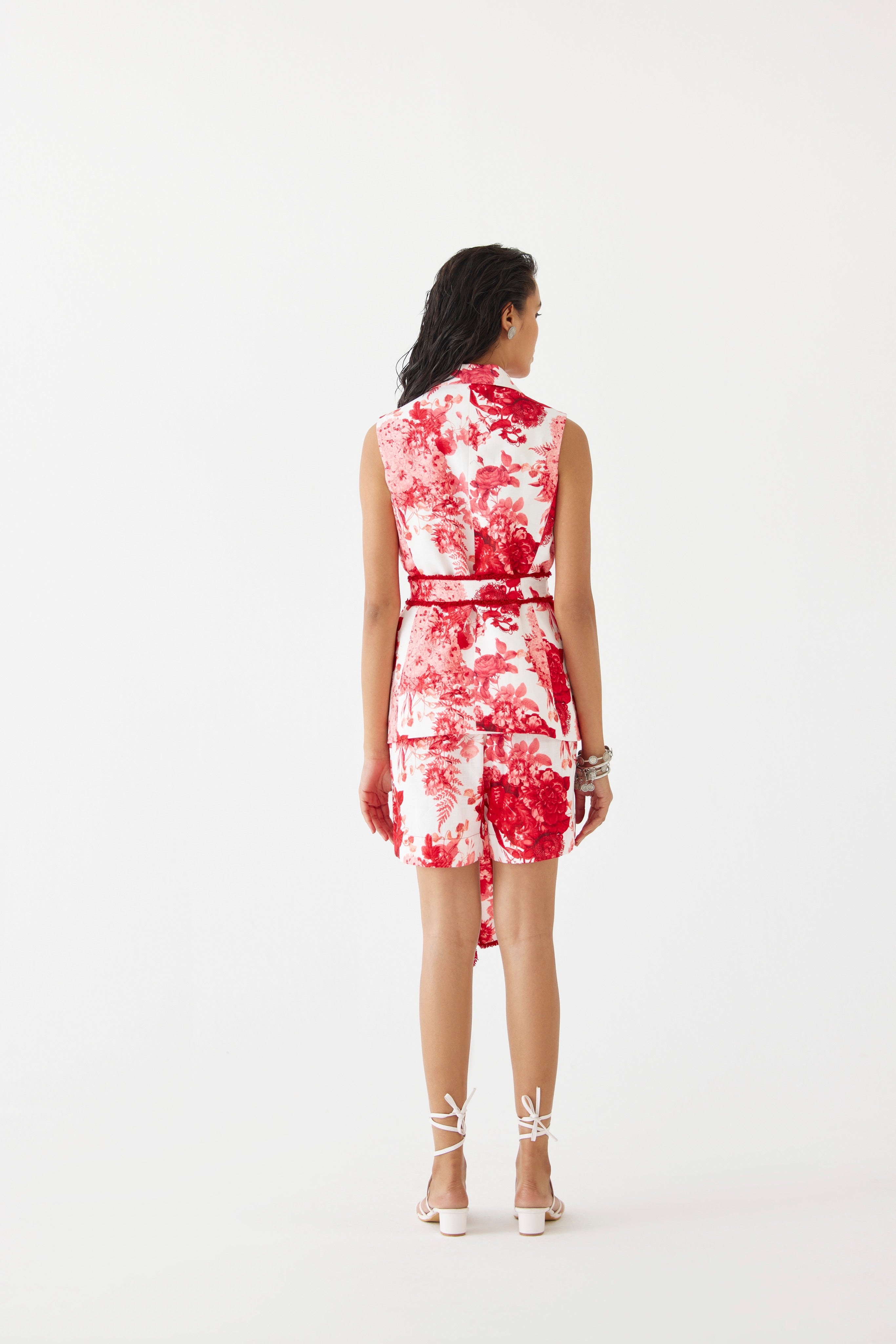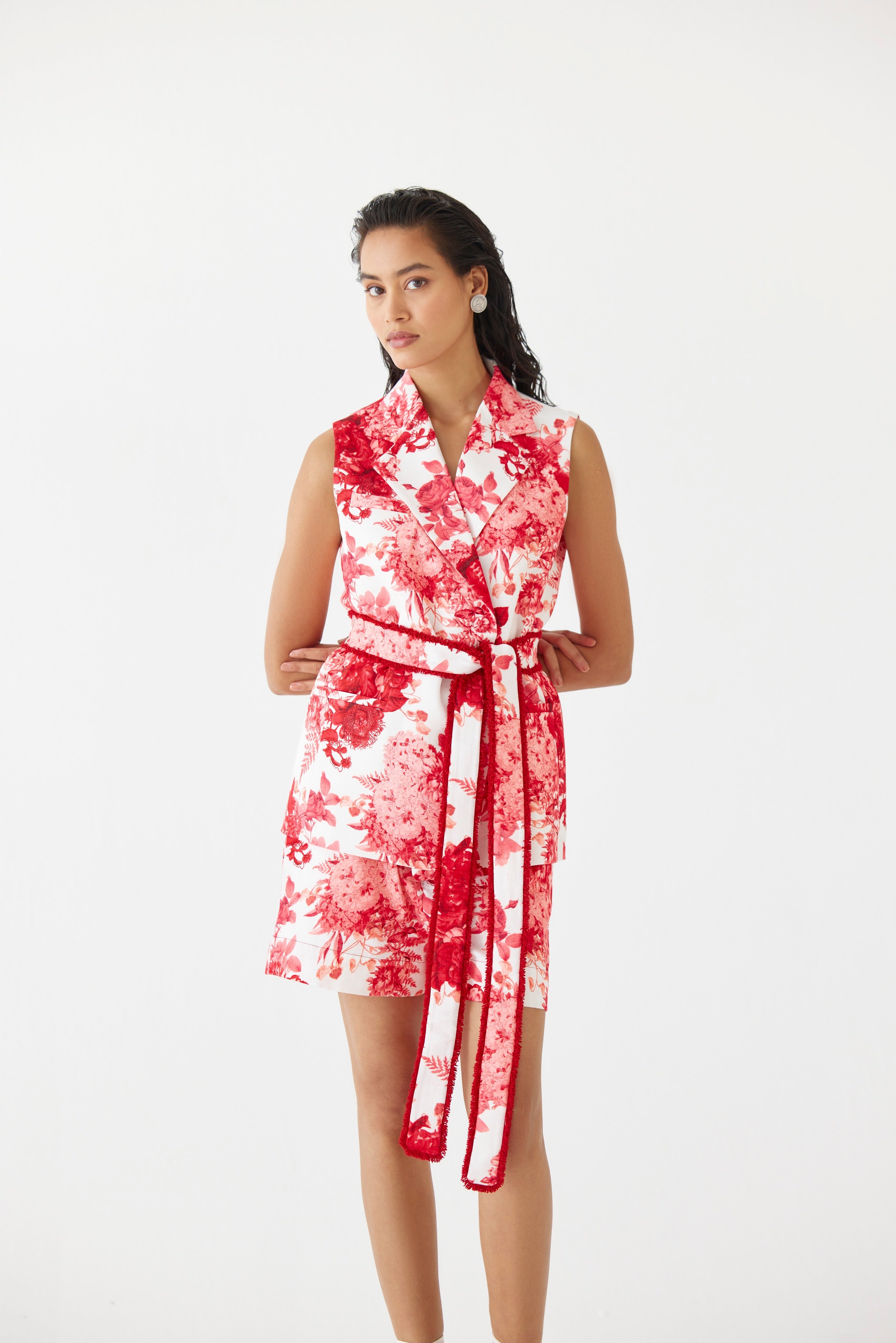 The Ruby Chintz Blazer & Shorts crafted from our 100% cotton fabrication, trans-seasonal, is a statement piece. The sleeveless blazer, made in our chintz print, is lined. With broad lapel, the piece has a relaxed fit and is part of a two piece set. Featuring a summery look, it is paired with our chintz lined shorts with pockets. It also has a belt with fringes. Wear it with heels for an elegant look.