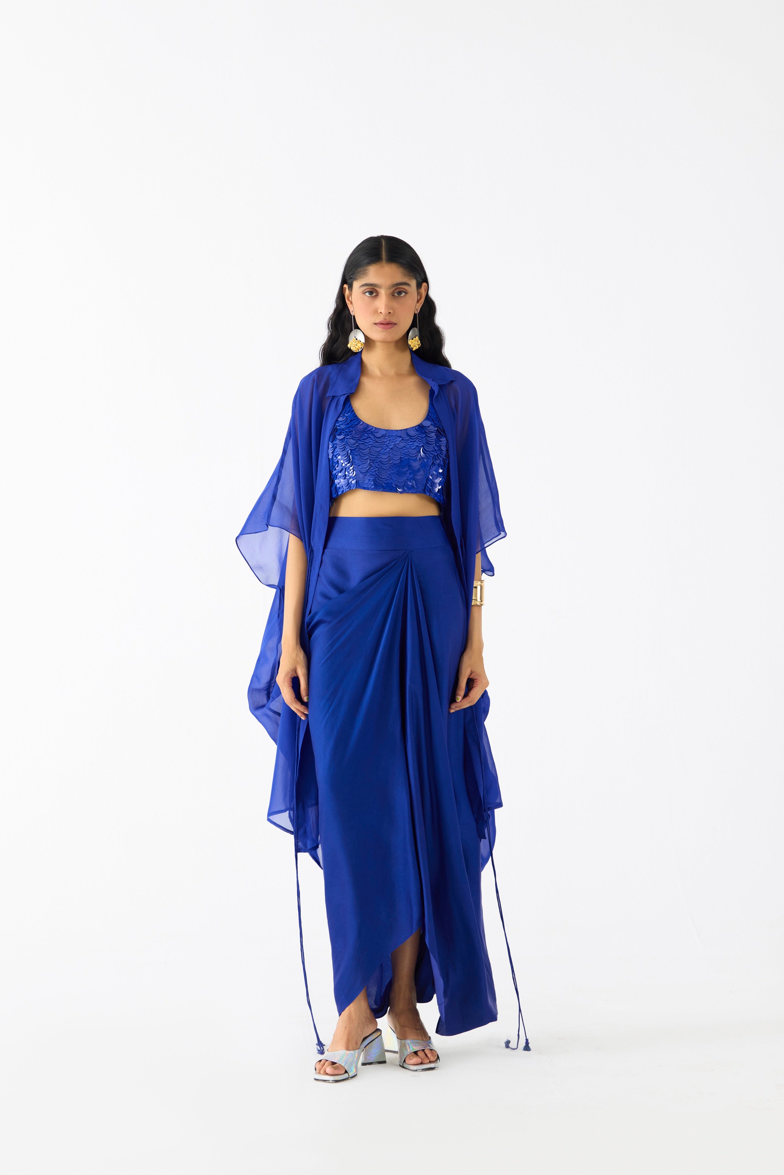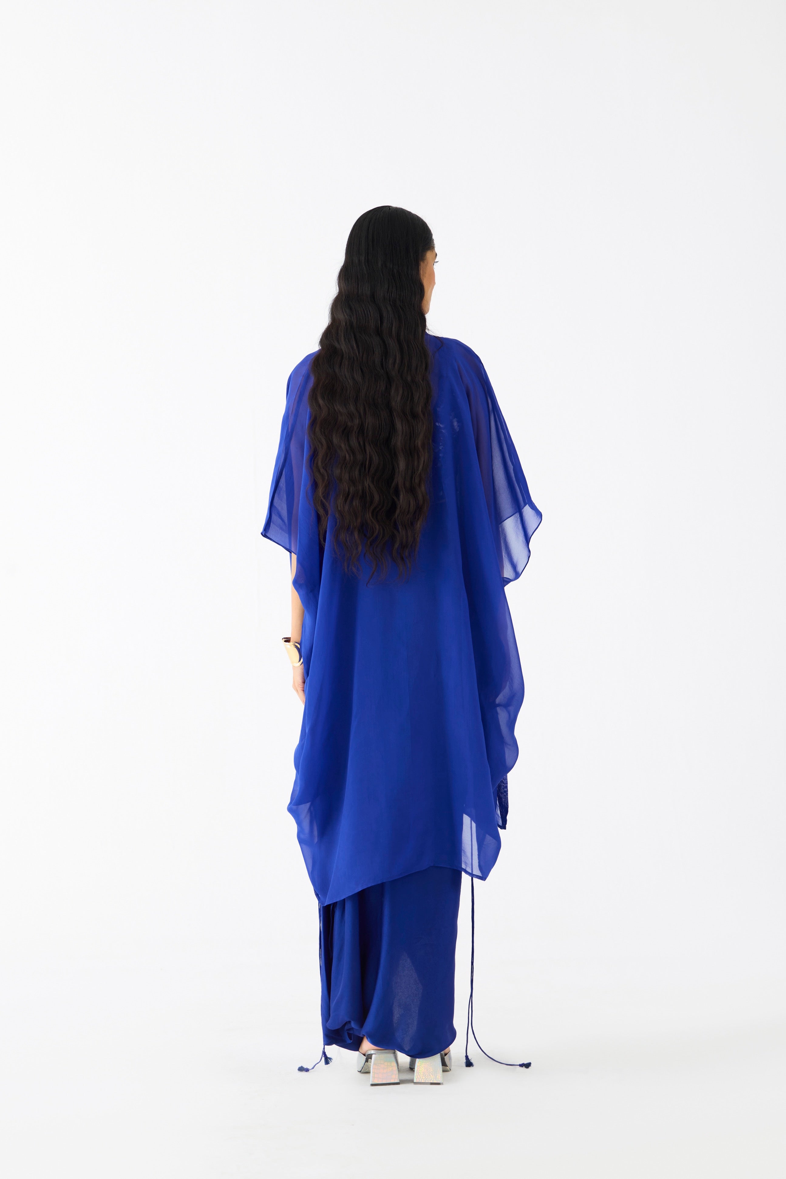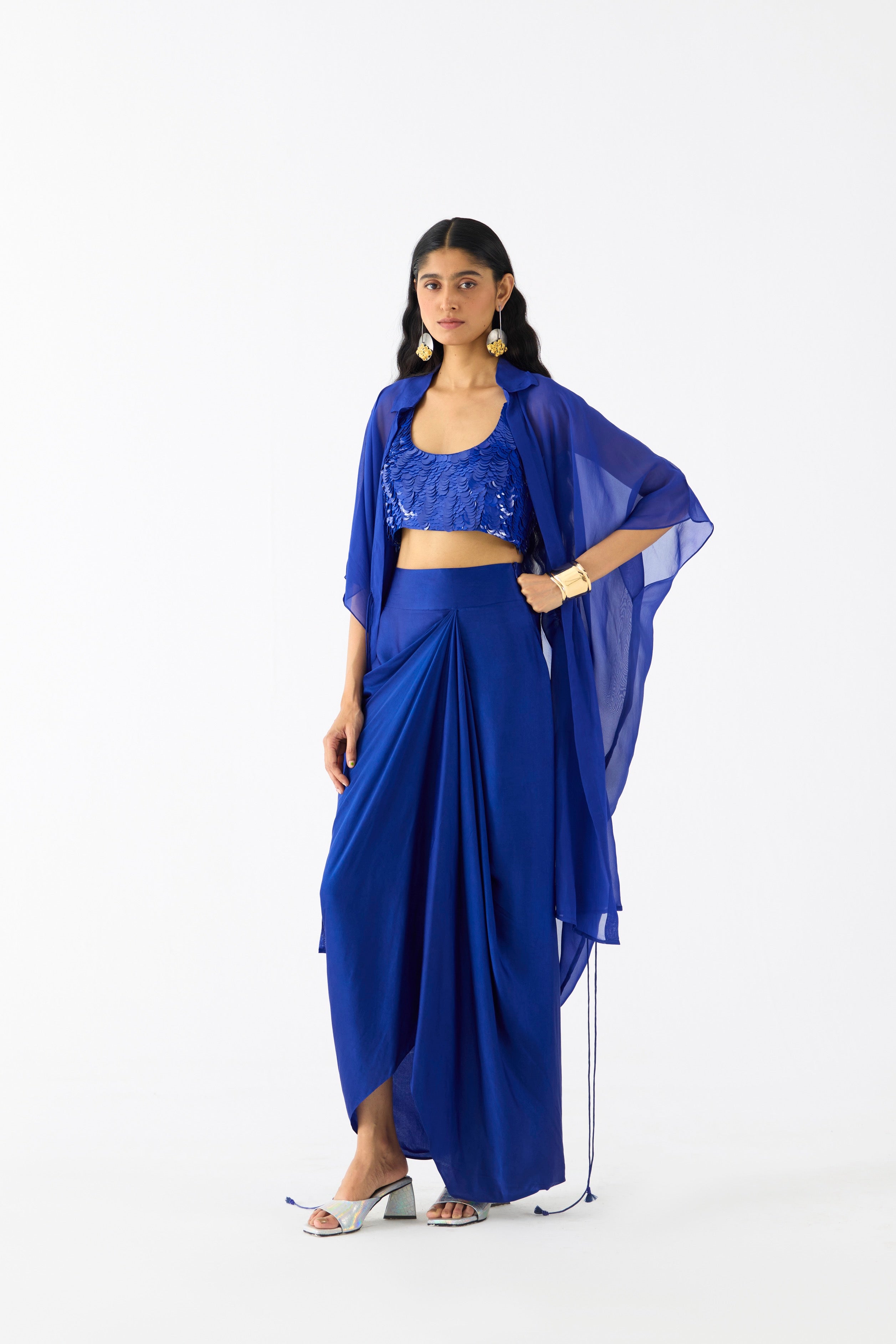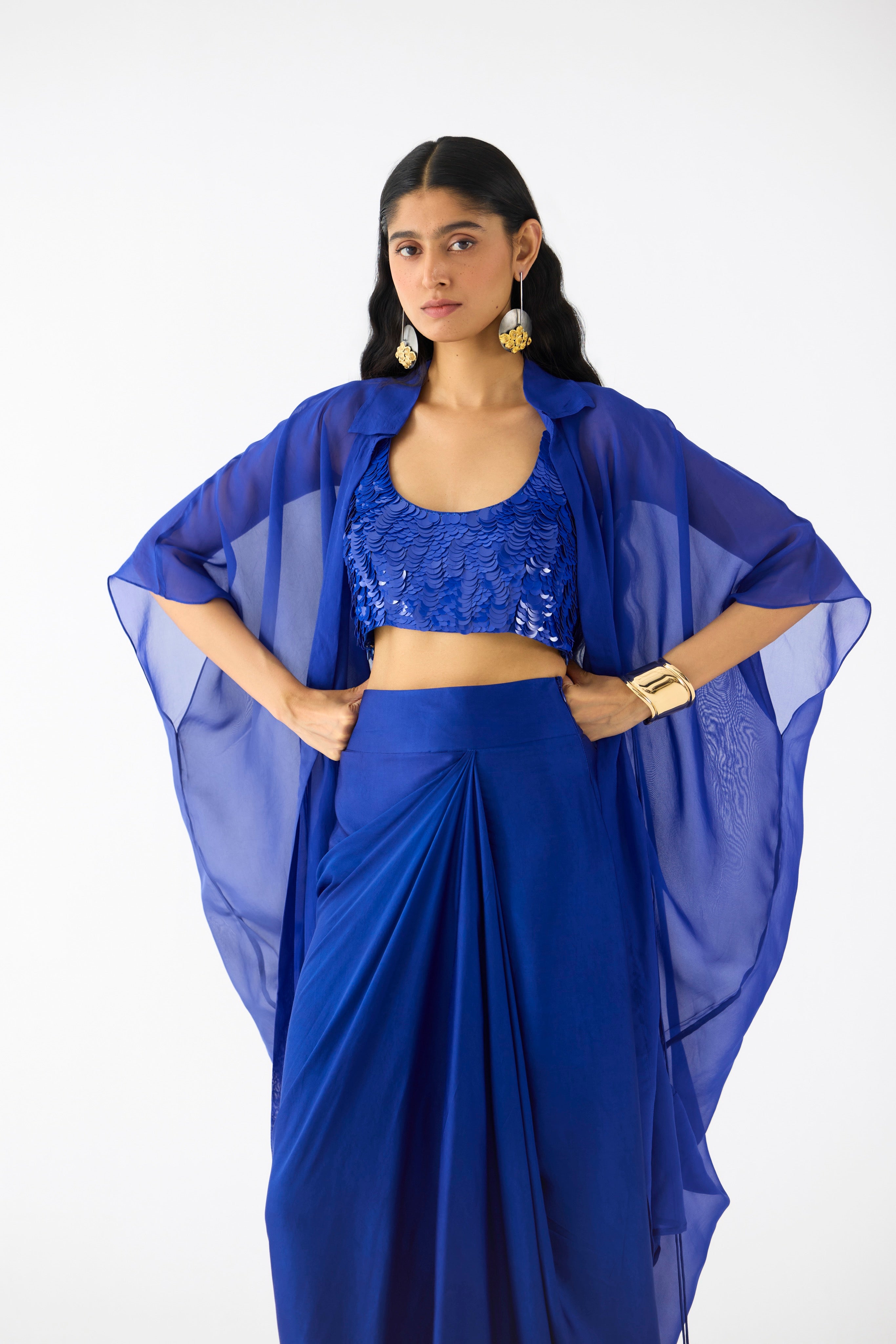 The Royal Organza Cape crafted from our stunning Organza fabrication, trans-seasonal, is a statement piece. The cape is hand dyed. Featuring ruching and gathers, the cape has drawstrings. The cape can be tied with a knot and can be styled in different ways. It is Free Size. Wear it with heels for an elegant look.