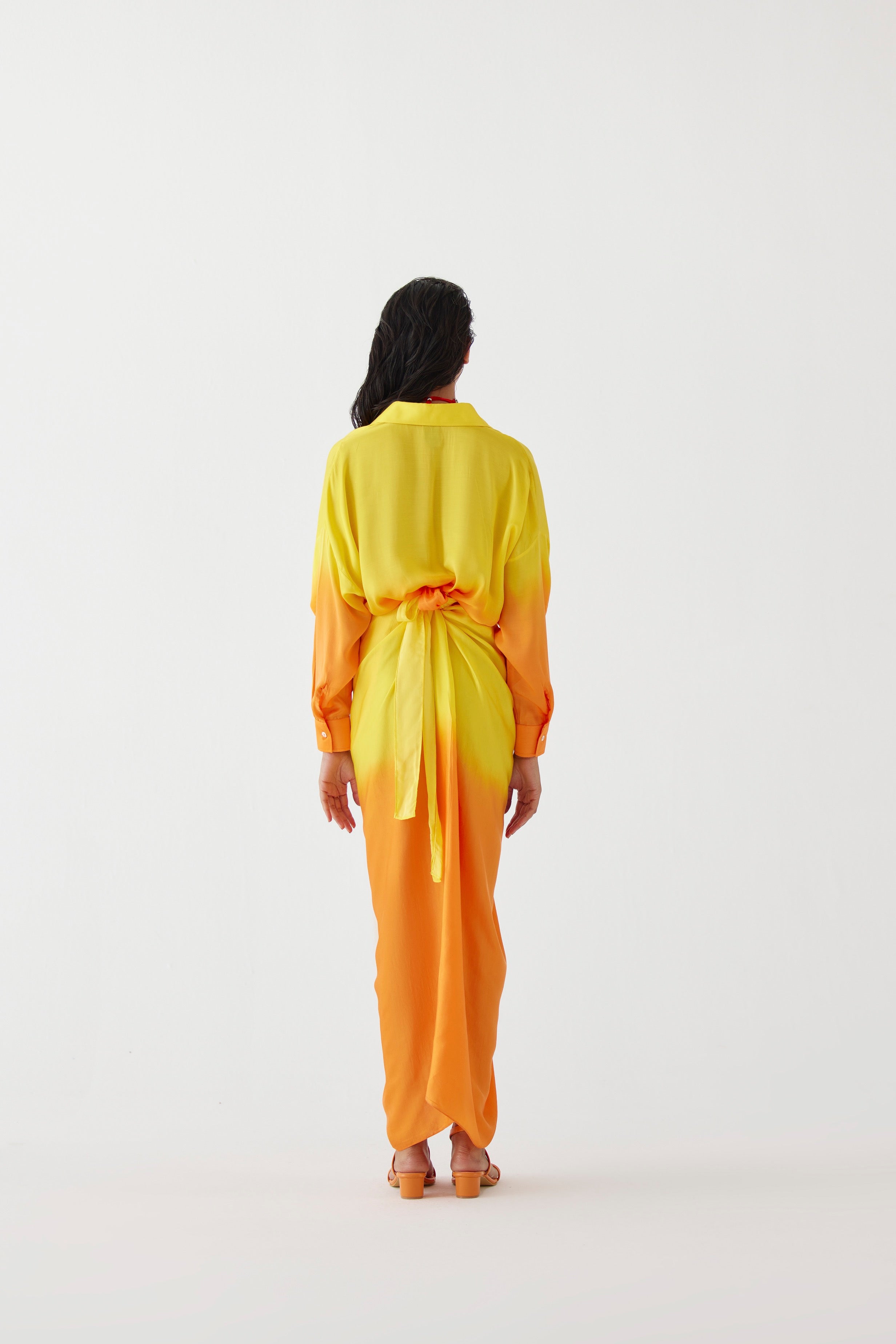 The Twilight Shirt Draped dress crafted from our stunning Vegan Silk fabrication, trans-seasonal, is a statement piece. The piece, made in our hand dyed cupro, is a one single dress. With tie ups at the waist, this dress in yellow & orange has a relaxed shirt on top and attached skirt at the bottom. Featuring a draped skirt, this piece can be tied with a knot and can be styled in different ways. Wear it with heels for an elegant look.
