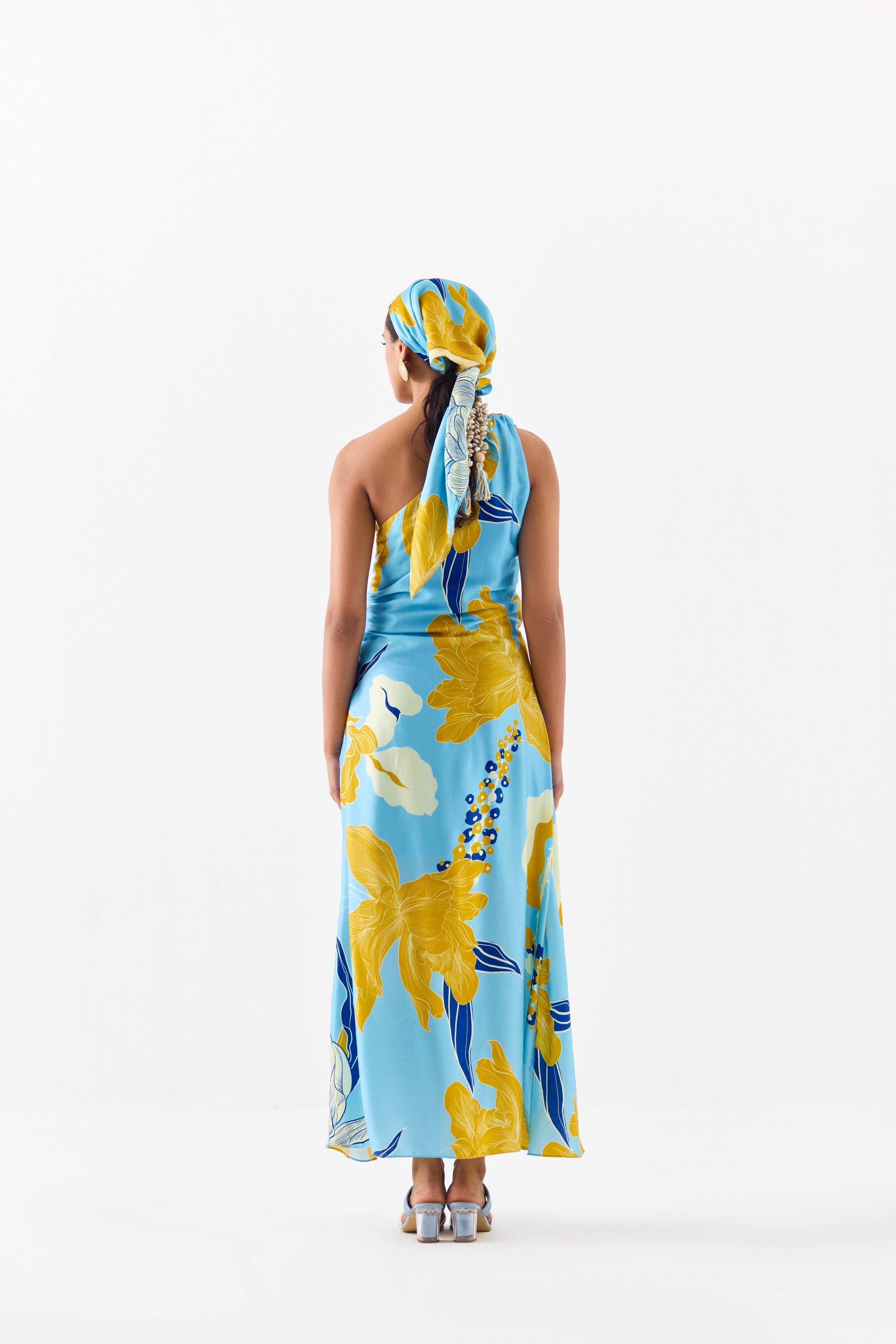 The White Rose One Shoulder Dress crafted from our stunning vegan silk fabrication, trans-seasonal, is a statement piece. Made in our White Rose print, this dress has a one shoulder and a side zipper. Featuring a drapey look, it has drawstrings in the front with shell tassles. Lined, this piece is versatile and can be styled in different ways. It can be Paired with heels for a festive look.