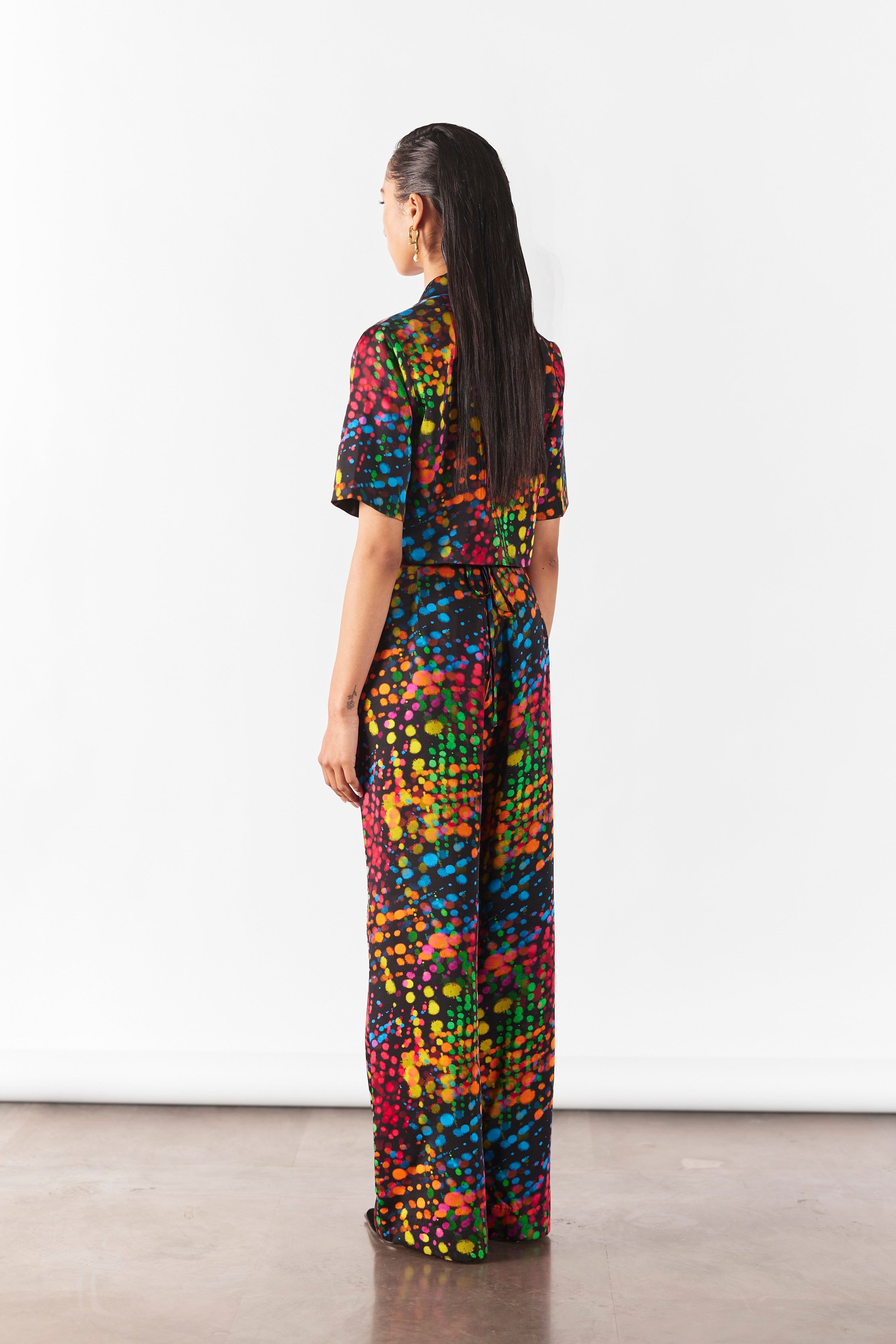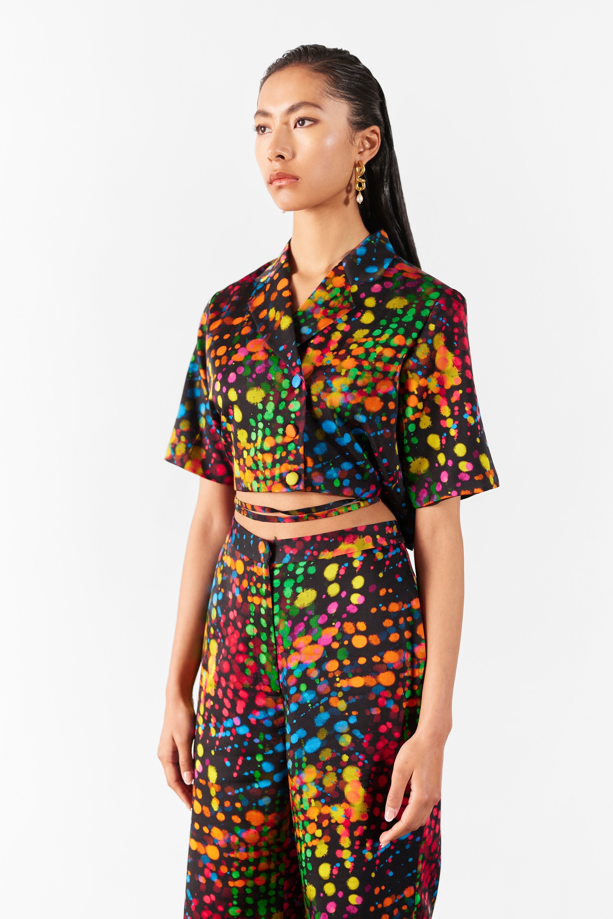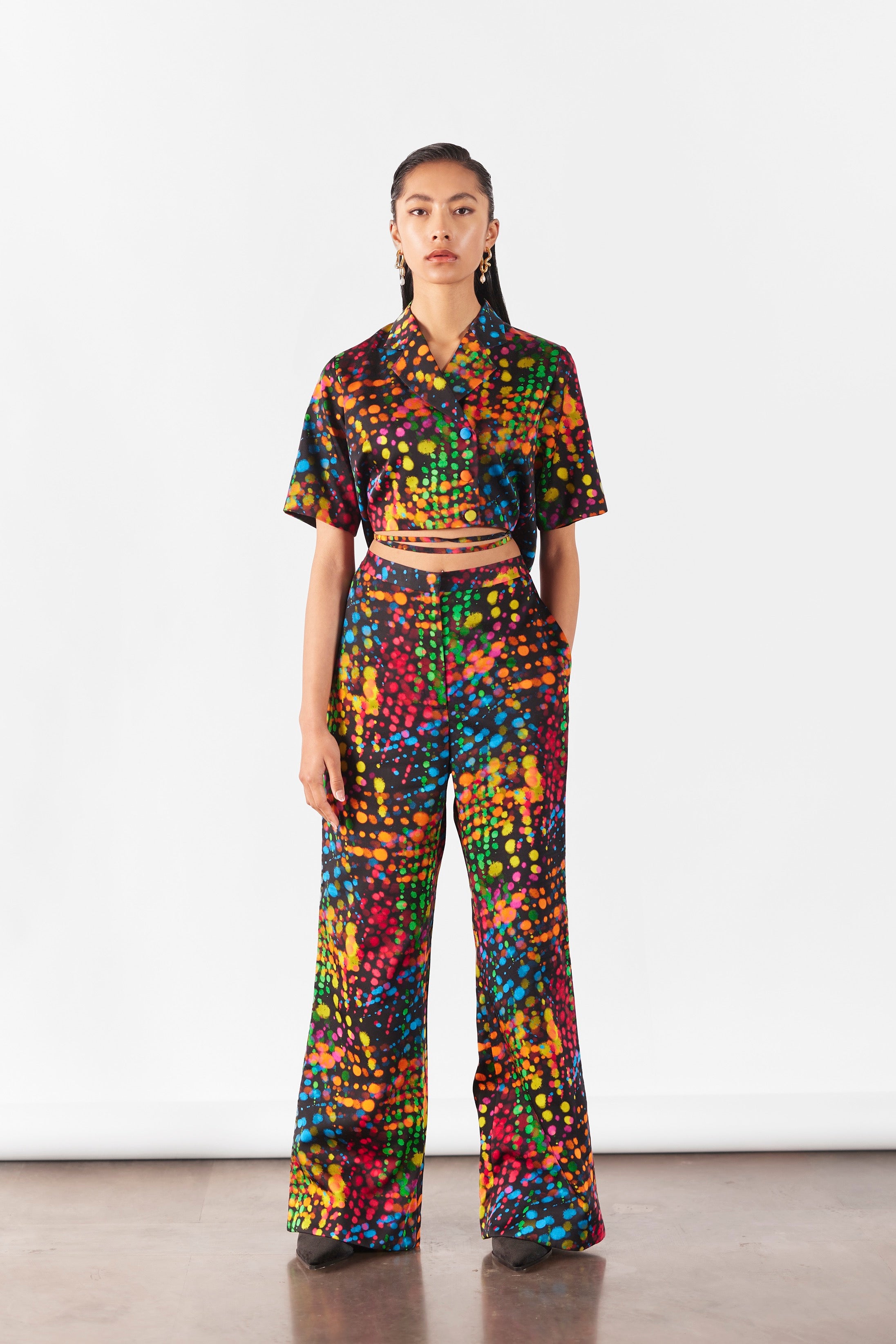 The Wildflower Crop Blazer & Trousers Co-ord crafted from our stunning Vegan Silk fabrication, trans-seasonal, is a statement piece. Made in our multi color splatter print inspired by the hazy views of an eden garden, the crop blazer is lined. With a knots on the waist, it is chic. Featuring a front opening, this piece is paired with matching trousers and can be styled in different ways. Wear it with heels for an elegant look.