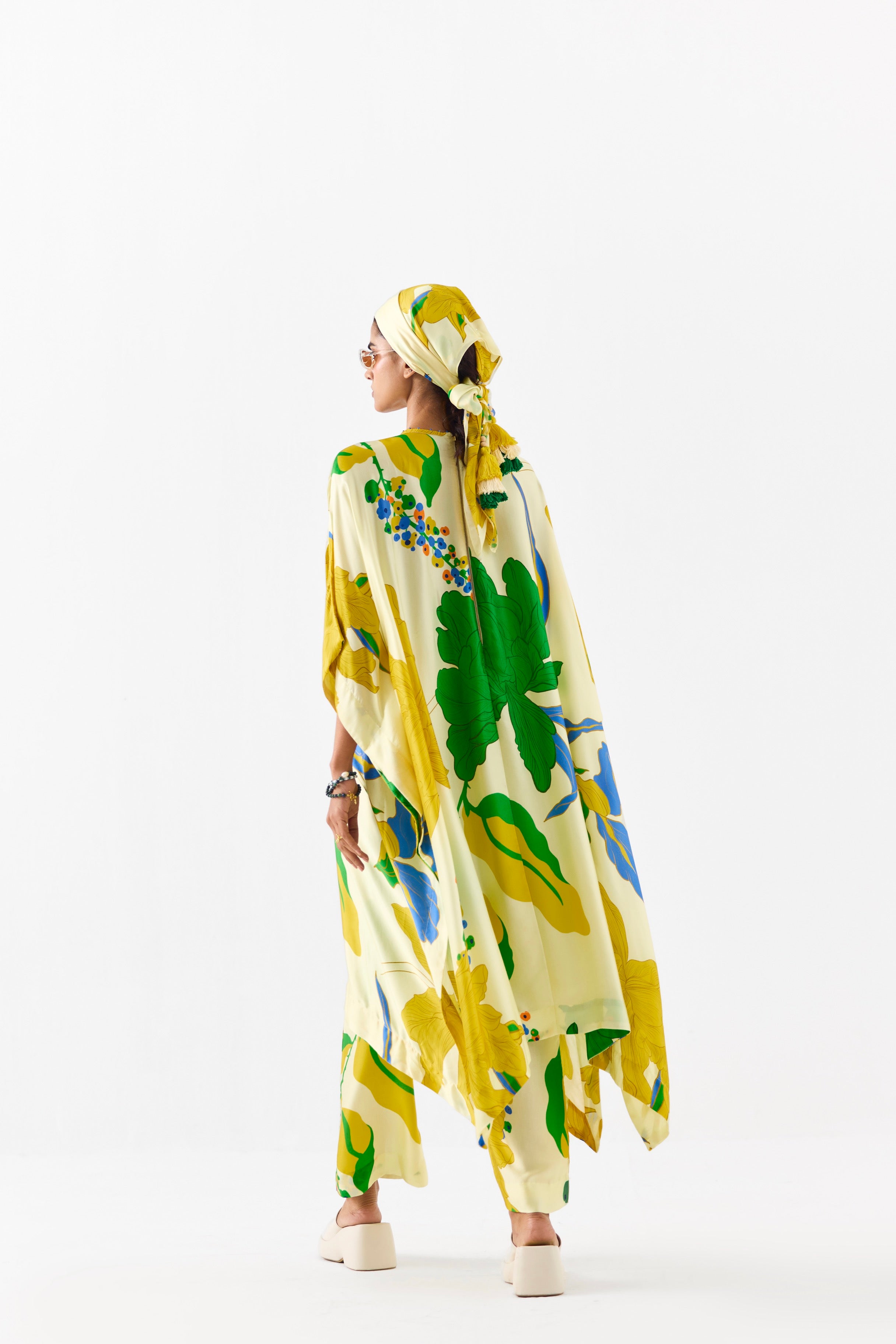 The Yellow Rose Kimono Kurta and Pants Co-ord crafted from our stunning Vegan Silk fabrication, trans-seasonal, is a statement piece. The piece, made in our original digitally printed yellow rose print in cupro, has a centre back metallic zipper. With kimono sleeves, this set has a round neckline with bead details. It is paired with our matching pants in the Yellow rose print with an elasticated back. Wear it with heels for an elegant look.