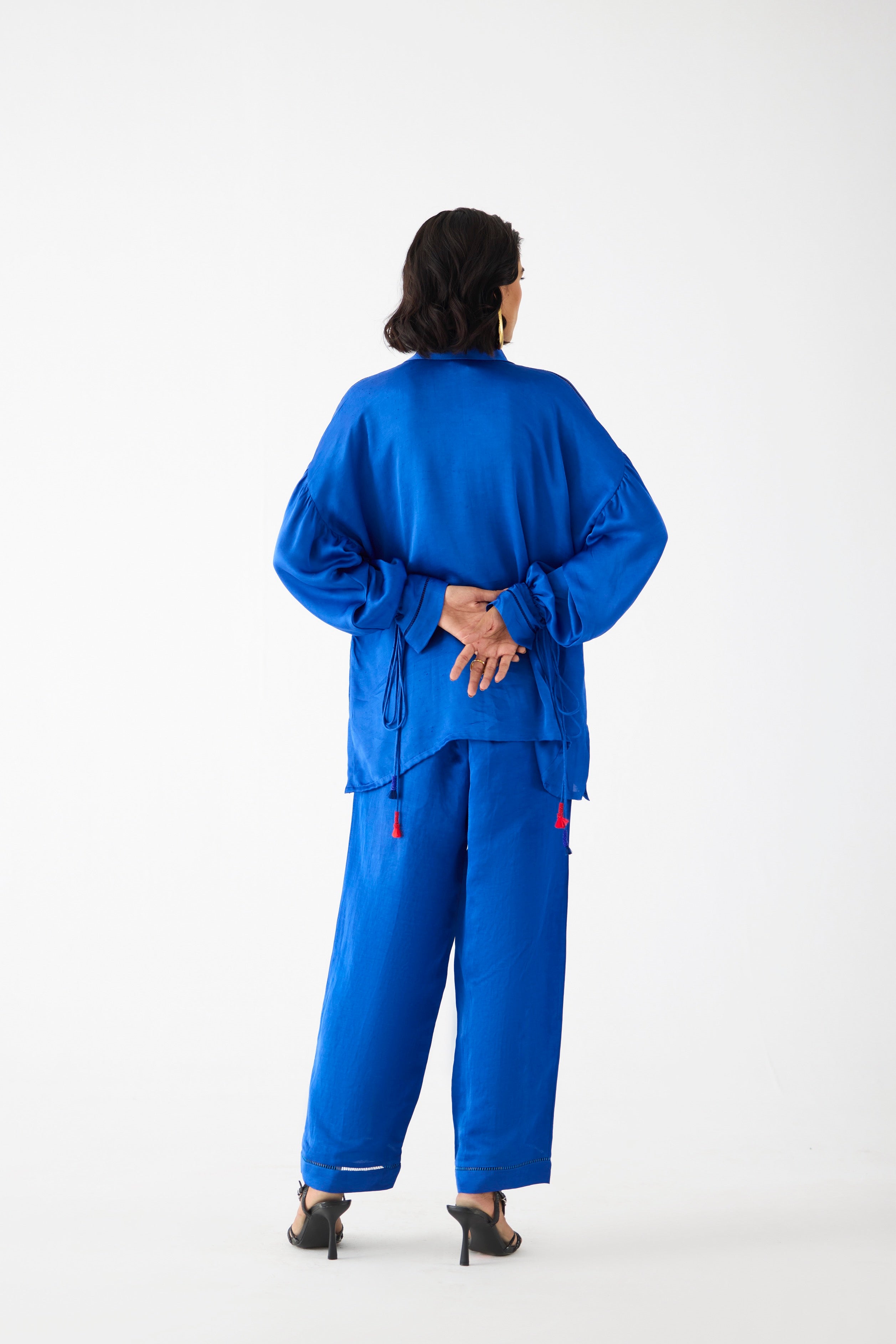 The Zulu Linen Blue Shirt crafted from our stunning Linen Satin fabrication, trans-seasonal, is a statement piece. The shirt, hand dyed, has a hand beaded patchwork inspired by Zulu woven baskets. With a delicate lace, this shirt has a relaxed fit and drawstring sleeves. Featuring a summery look, it has gathers on the sleeves. It can be paired with our matching front zipper trousers with elastic on the back, it looks chic. Wear it with heels for an elegant look.