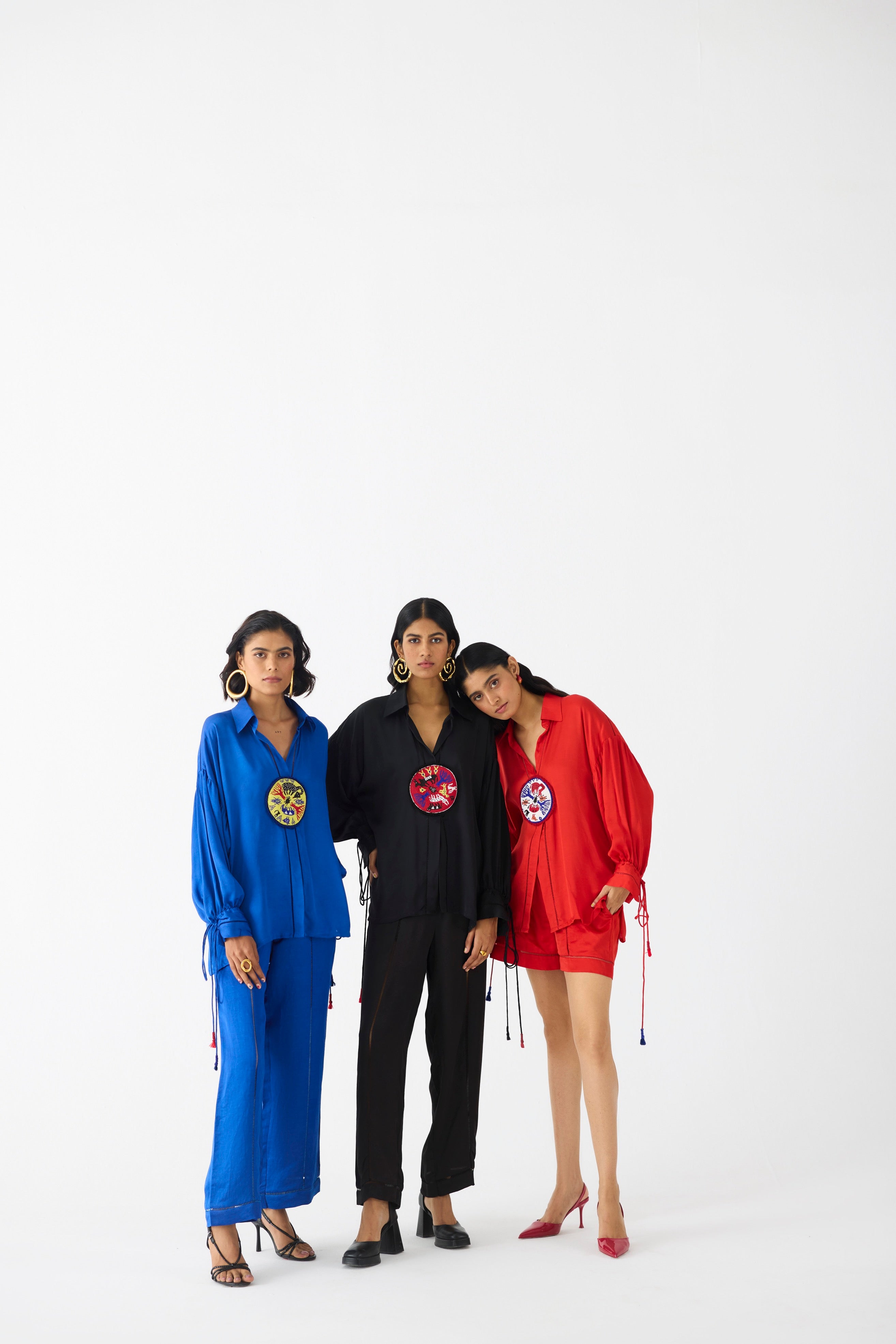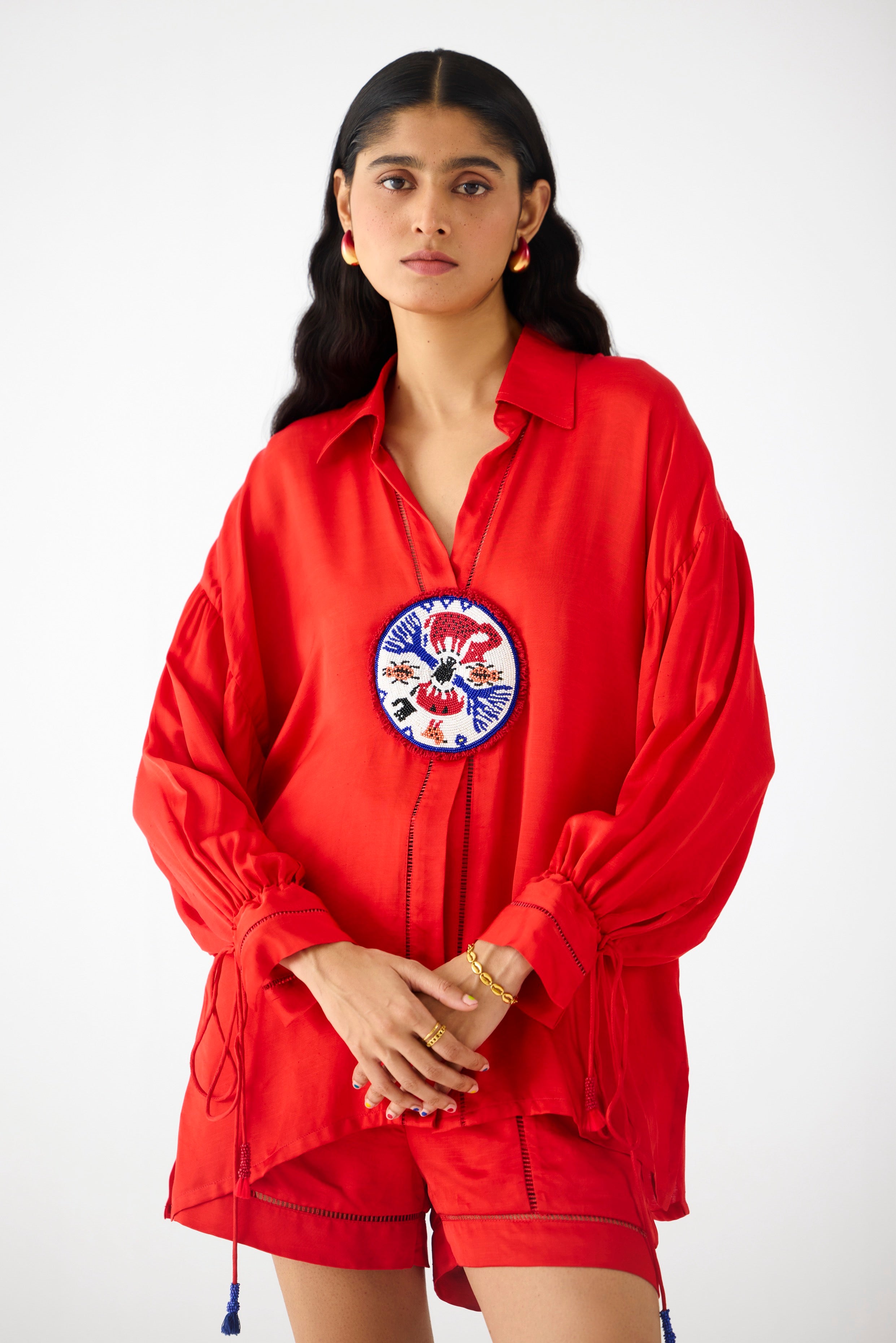The Zulu Linen Red Shirt crafted from our stunning Linen Satin fabrication, trans-seasonal, is a statement piece. The shirt, hand dyed, has a hand beaded patchwork inspired by Zulu woven baskets. With a delicate lace, this shirt has a relaxed fit and drawstring sleeves. Featuring a summery look, it has gathers on the sleeves. It can be paired with our matching front zipper shorts with elastic on the back, it looks chic. Wear it with heels for an elegant look.